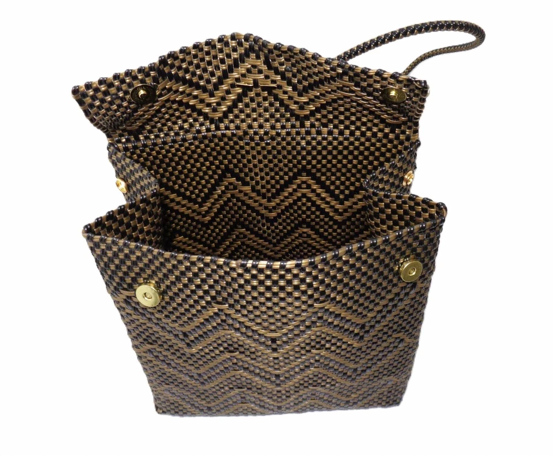 A backpack so versatile, you'll want to carry this with you everywhere. Discover the Women's Native Backpack by Lola's Bag, a unique blend of tradition and style in Yellow Aztec. Handcrafted by skilled artisans from Southeast Mexico, this backpack is meticulously woven from recycled plastic, featuring braided top handles and a magnetic clasp closure. It is lightweight, waterproof, and durable, making it an ideal choice for everyday use. Dimensions are approximately 10 in x 5.5 in x 10.5 in for medium size and 9 in x 4.6 in x 7 in for small size, with a care suggestion to hand wash for cleaning.