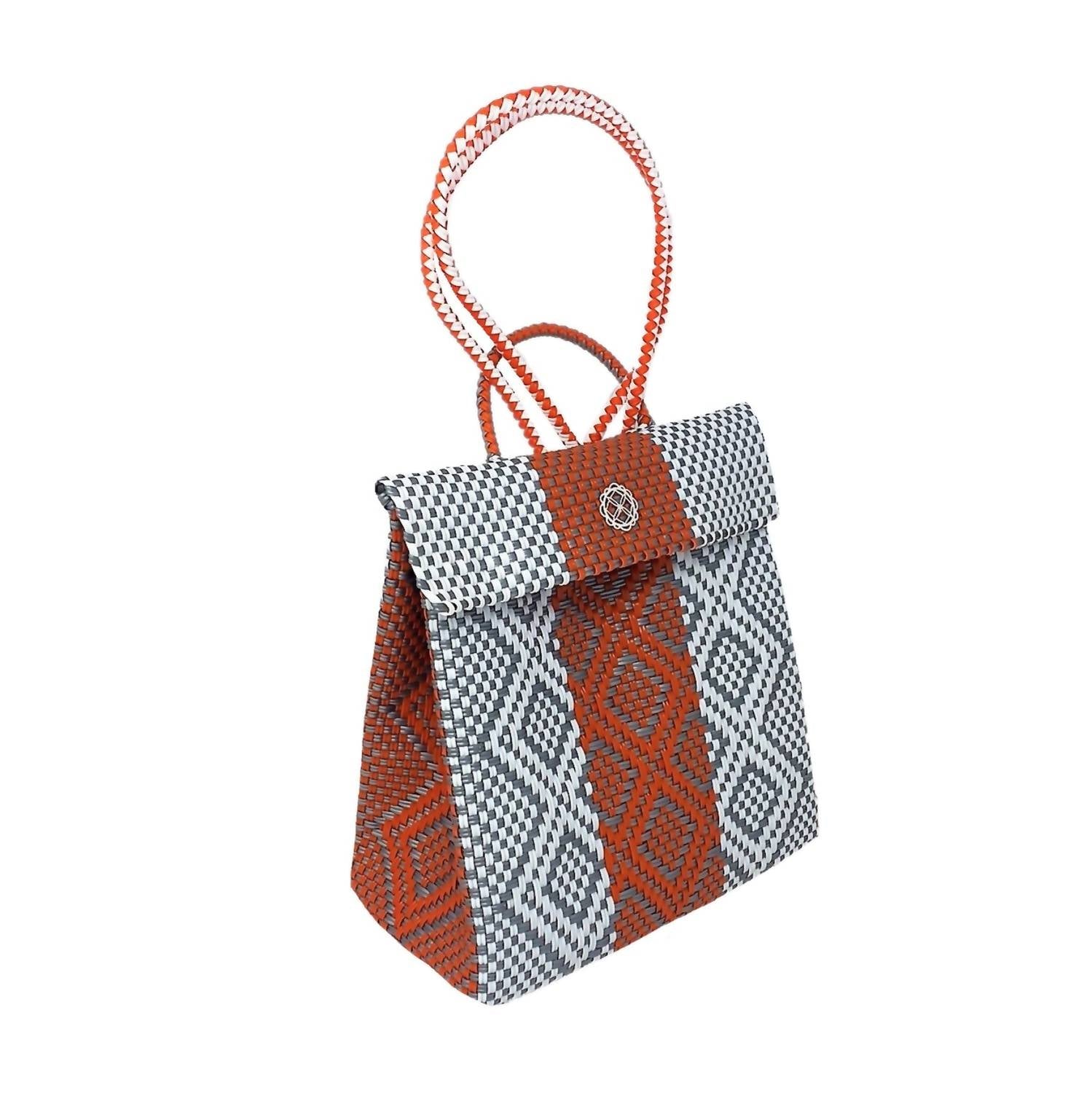 A backpack so versatile, you'll want to carry this with you everywhere. Discover the Women's Native Backpack by Lola's Bag, a unique blend of tradition and style in Yellow Aztec. Handcrafted by skilled artisans from Southeast Mexico, this backpack is meticulously woven from recycled plastic, featuring braided top handles and a magnetic clasp closure. It is lightweight, waterproof, and durable, making it an ideal choice for everyday use. Dimensions are approximately 10 in x 5.5 in x 10.5 in for medium size and 9 in x 4.6 in x 7 in for small size, with a care suggestion to hand wash for cleaning.