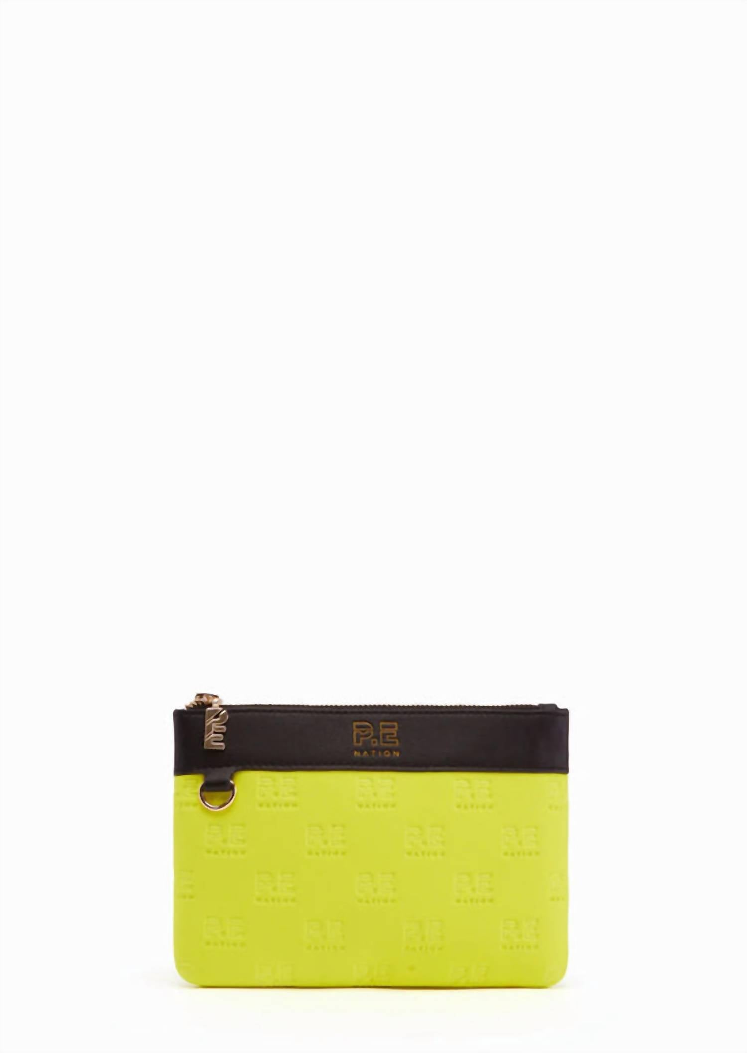 Lipstick, check. Mints, check. Credit card, check. The cutest little bag that holds all of your necessities. The Ultimatum Pouch by P.E. Nation is a chic and versatile accessory perfect for the modern woman. Crafted from 100% soft matte neoprene in a vibrant yellow, this clutch can effortlessly hold any size smartphone and small essentials. It features gold-plated hardware, a P.E Nation zipper puller, and a debossed logo on the leather-style trim, enhancing its sophisticated look. Measuring 5.51 inches in height, 8.27 inches in width, and 0.39 inches in depth, this vegan-friendly pouch can be used as a clutch, pouch, or makeup bag.