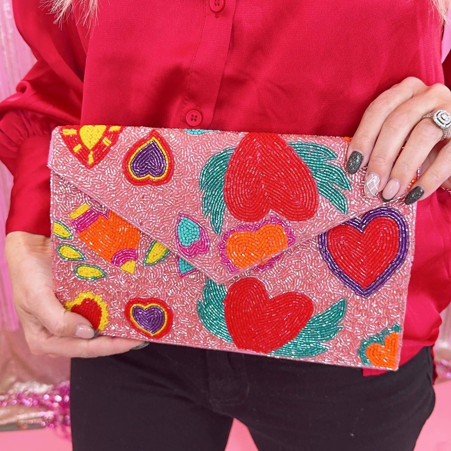 Introducing the Women's Wing Heart Clutch Bag by Treasure Jewels, a striking accessory in vibrant pink. This clutch showcases the intricate craftsmanship of Colombian heritage, adorned with dazzling beads. It embodies the rich cultural tapestry of South America, making it a perfect statement piece for any ensemble.