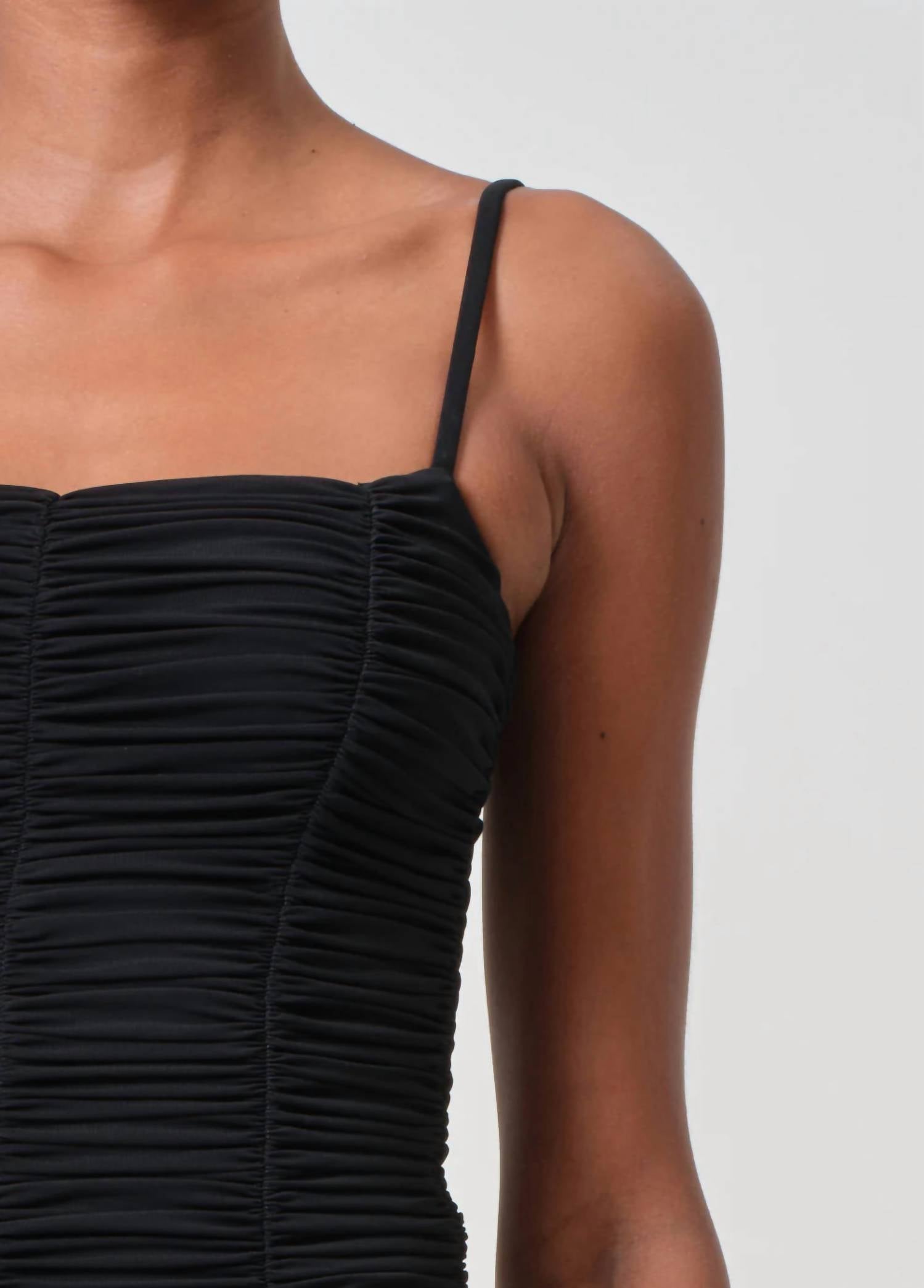 Pair this number with your favorite high-waisted jeans. Discover the Ezra Bodysuit by AGOLDE, a chic staple in a true clean black hue. Featuring spaghetti straps and crafted from a lightweight viscose blend with 94% Viscose and 6% Elastane, it offers a textured, smooth feel. Made in the USA with imported materials, it promises a perfect silhouette with ultra-fine shirring throughout. Care for this bodysuit with machine wash instructions, ensuring lasting quality and fit.