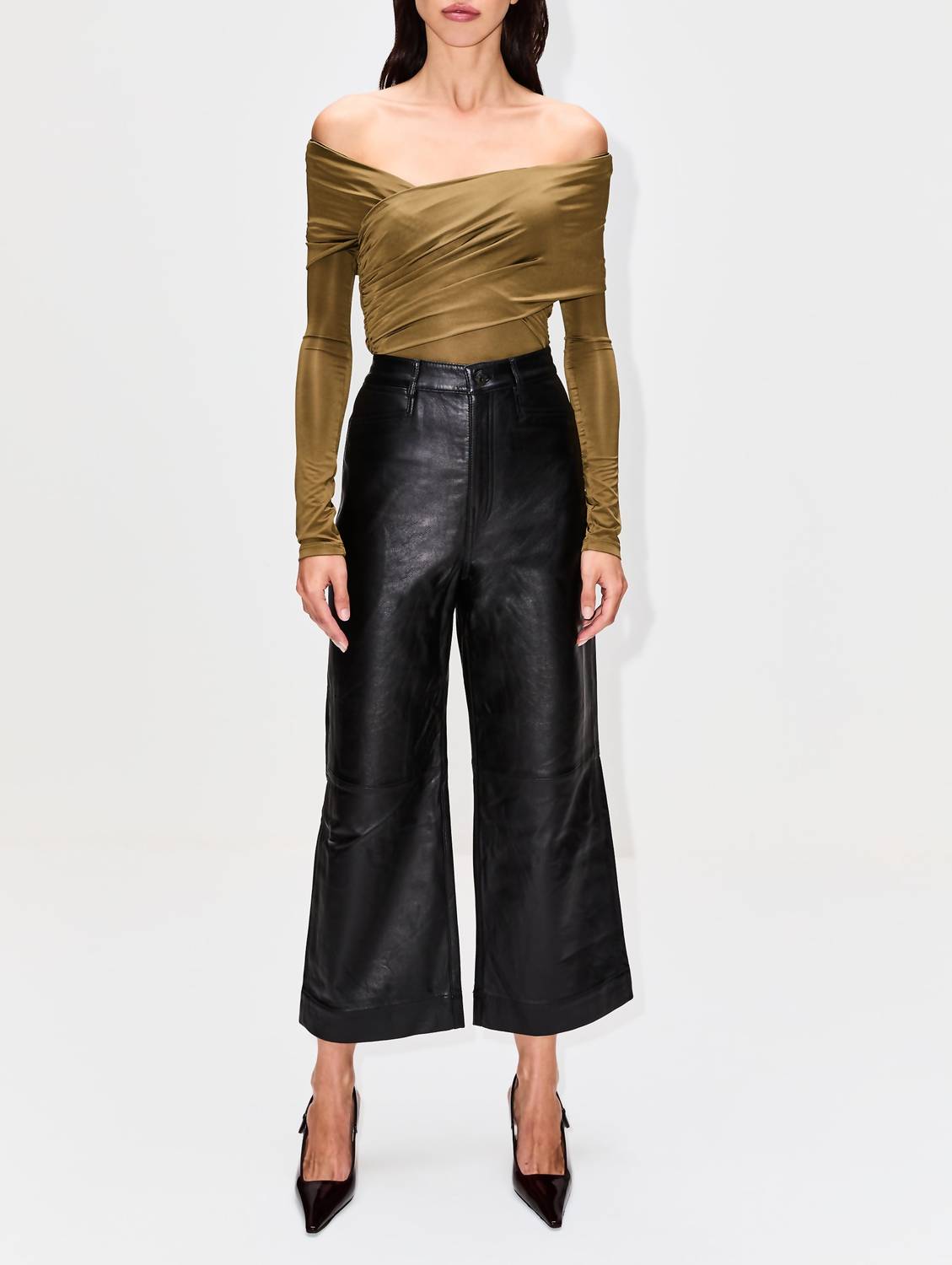 Form fitting and comfortable - this bodysuit check all of the boxes. Introducing the Otto Bodysuit by Paris Georgia, a chic addition to your wardrobe in an elegant olive hue. This long-sleeve bodysuit is crafted from a luxurious viscose blend, featuring an off-the-shoulder neckline that accentuates the decolletage. It offers an adjustable center-front wire and versatile straps for a customizable fit. With a pull-on closure, caring for this piece is simple with dry clean instructions. 93% Viscose 7% Spandex.