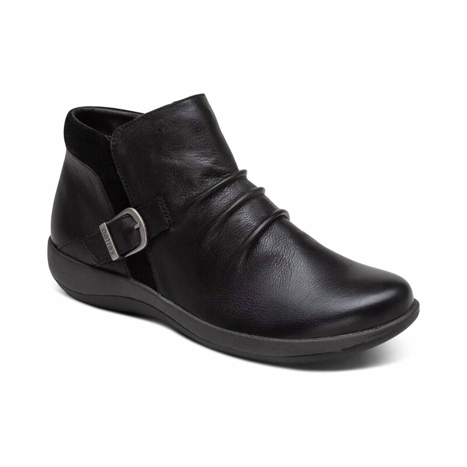 Discover the Women's Luna Buckle Boot by Aetrex, a stylish ankle bootie crafted from genuine leather and nubuck, perfect for your next concert. Designed with a round toe and a low flat heel of 1 5/16 inches, it offers both style and comfort. The boot features a side zipper closure and an adjustable buckle for a tailored fit, complemented by a lightweight EVA midsole and rubber outsole for effortless wear. Available in chic black, this boot includes a removable insole for customizable comfort.
