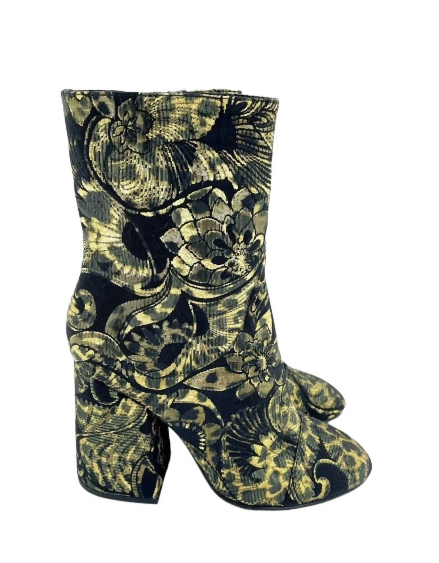 Say hello to the perfect, most versatile boot. The ankle height makes this style easily transition from day to night. Wear them with your favorite skinny jeans and tee for a more laid back look, or pair them with your favorite mini dress and jacket for a night out on the town. Dress up your winter outfit with these elegant metallic jacquard boots featuring Floral print in gold and black Side zipper closure Almond toe and covered block heel Fabric upper, leather lining and sole