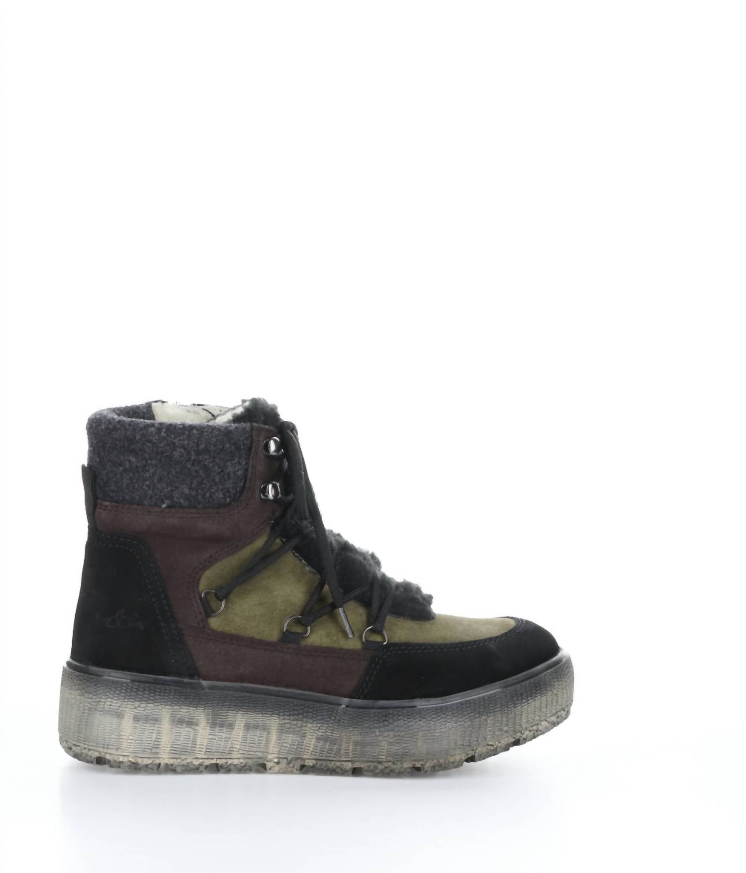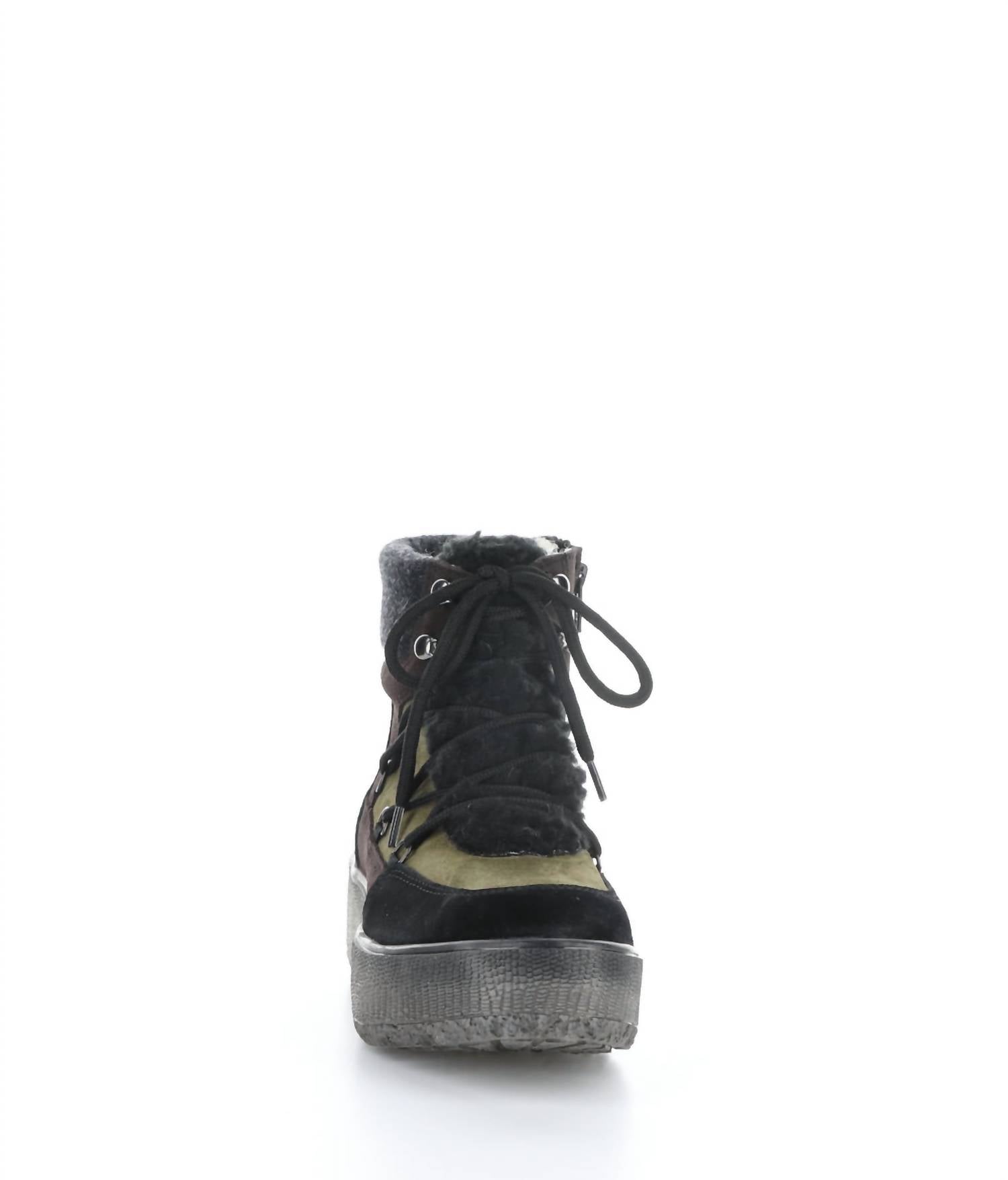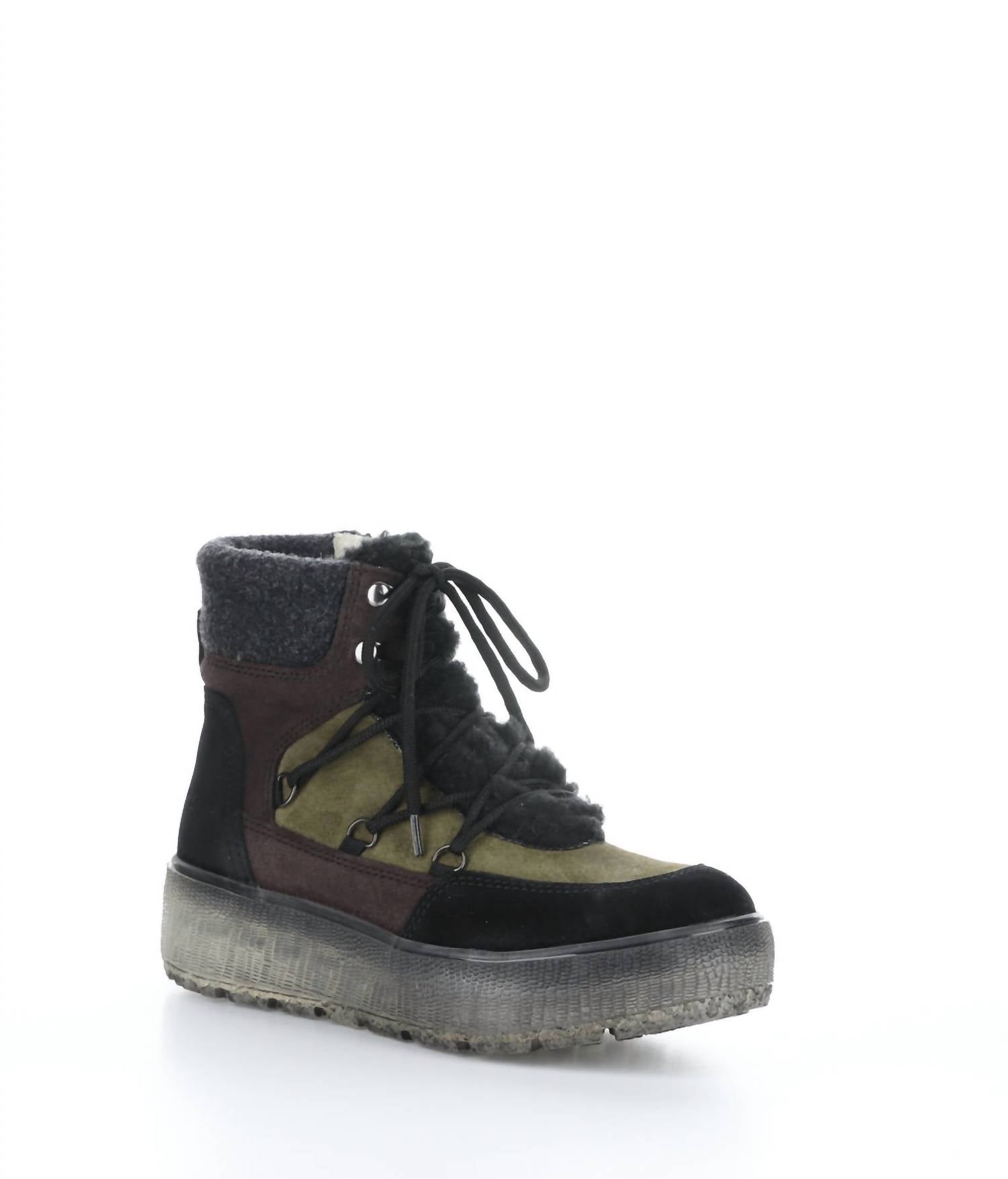 Step into style with the Women's Ideal Waterproof Boot by Bos. & Co., crafted for durability and comfort. These ankle boots feature a Suede and Tweed upper, Merino Wool lining, and an easy side zipper closure, while adjustable laces offer a customized fit. They are designed with a 1.5-inch platform and a 5-inch shaft height, with a 12-inch shaft circumference, making them perfect for any adventure. Made in Portugal, these boots are available in Black/Olive/Plum and are perfect for keeping feet dry and stylish.