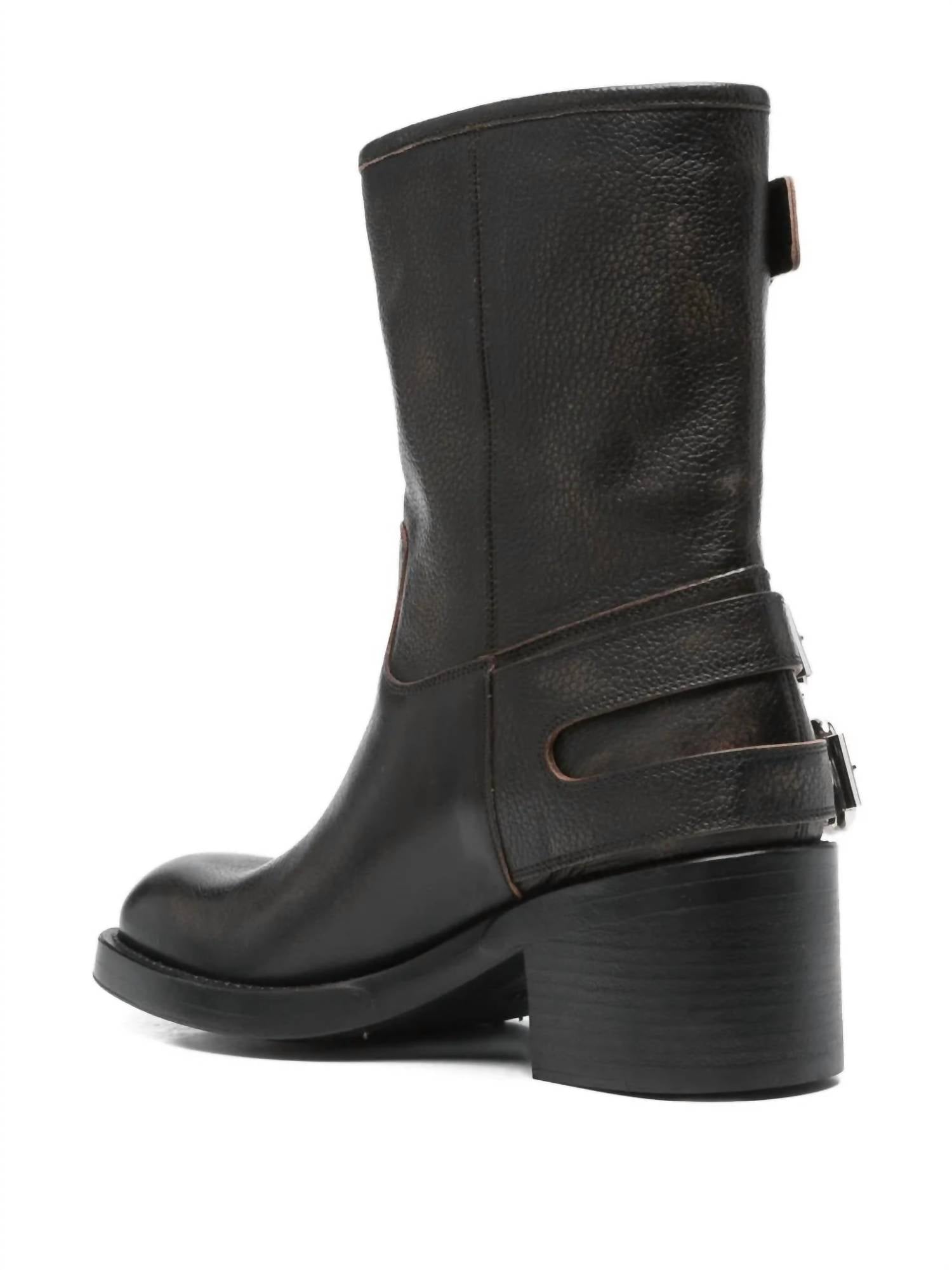 Introducing the Women's Dakota Ankle Boot by Chloé, designed for a stylish yet robust look. These mid-calf boots feature a slip-on closure and are crafted from high-quality grained brushed calfskin, embodying inspiration from classic biker boots. Completed with a block heel height of 2.4 inches and multiple silver-tone Paddington buckles, they offer both style and durability, made in Italy. Perfect for the fall season and travel occasions, these boots reflect Chloé's commitment to sustainability, utilizing Leather Working Group certified materials.