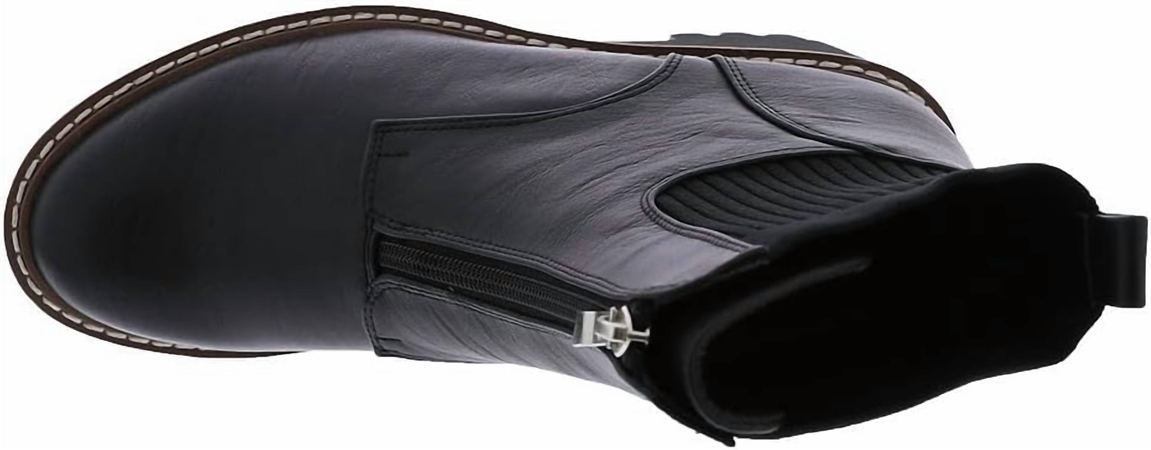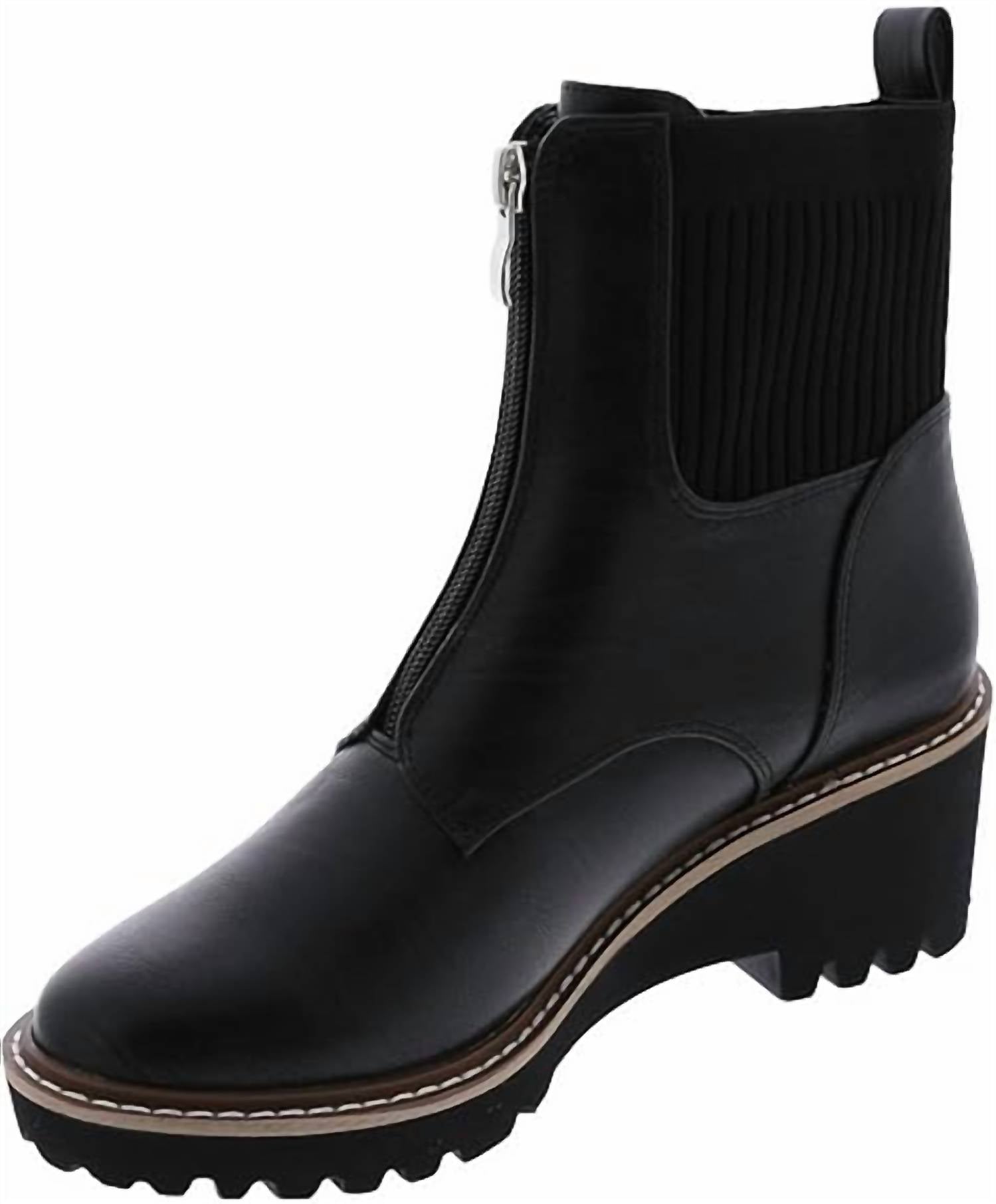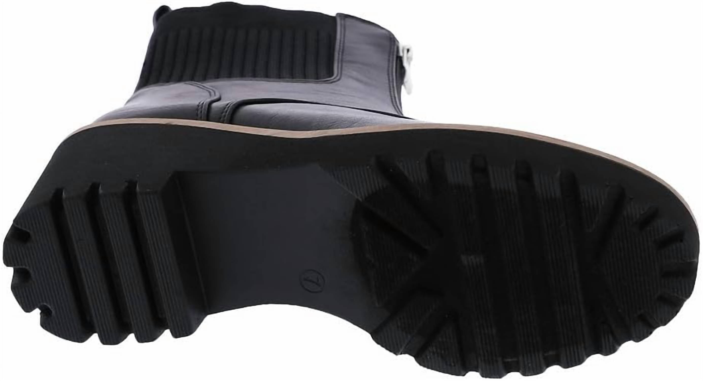Introducing the Women's Boo Black Boots by Corkys Footwear, an essential addition to any fall wardrobe. These ankle boots feature a chunky black stretchy design with a convenient front zipper for easy wear. Designed with a round toe and a stylish wedge heel, they offer a comfortable 2.5-inch lift. Perfect for embracing the western trend this season.