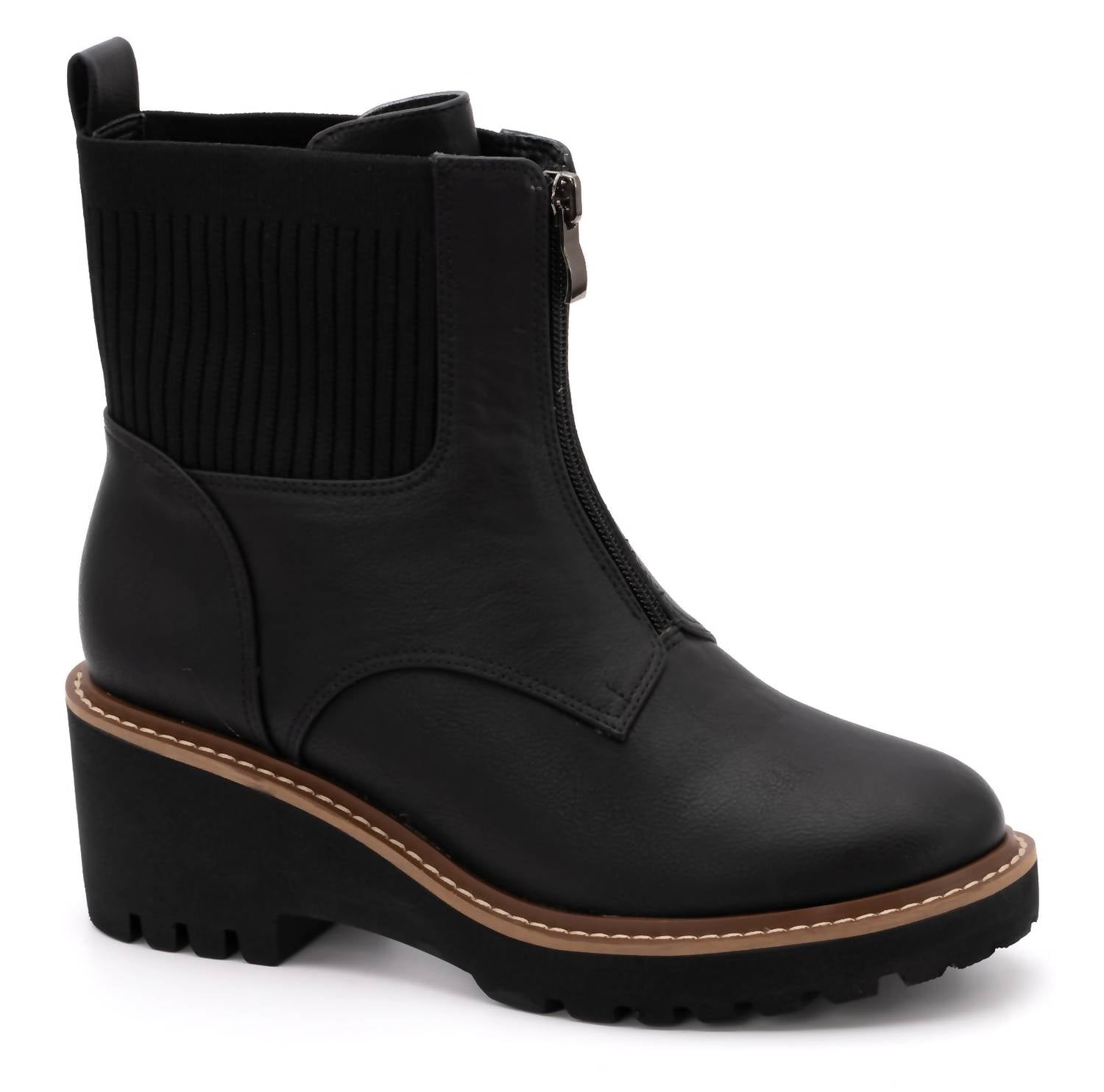 Say hello to the perfect, most versatile boot. The ankle height makes this style easily transition from day to night. Wear them with your favorite skinny jeans and tee for a more laid back look, or pair them with your favorite mini dress and jacket for a night out on the town. Introducing the Women's Boo Black Boots by Corkys Footwear, an essential addition to any fall wardrobe. These ankle boots feature a chunky black stretchy design with a convenient front zipper for easy wear. Designed with a round toe and a stylish wedge heel, they offer a comfortable 2.5-inch lift. Perfect for embracing the western trend this season.