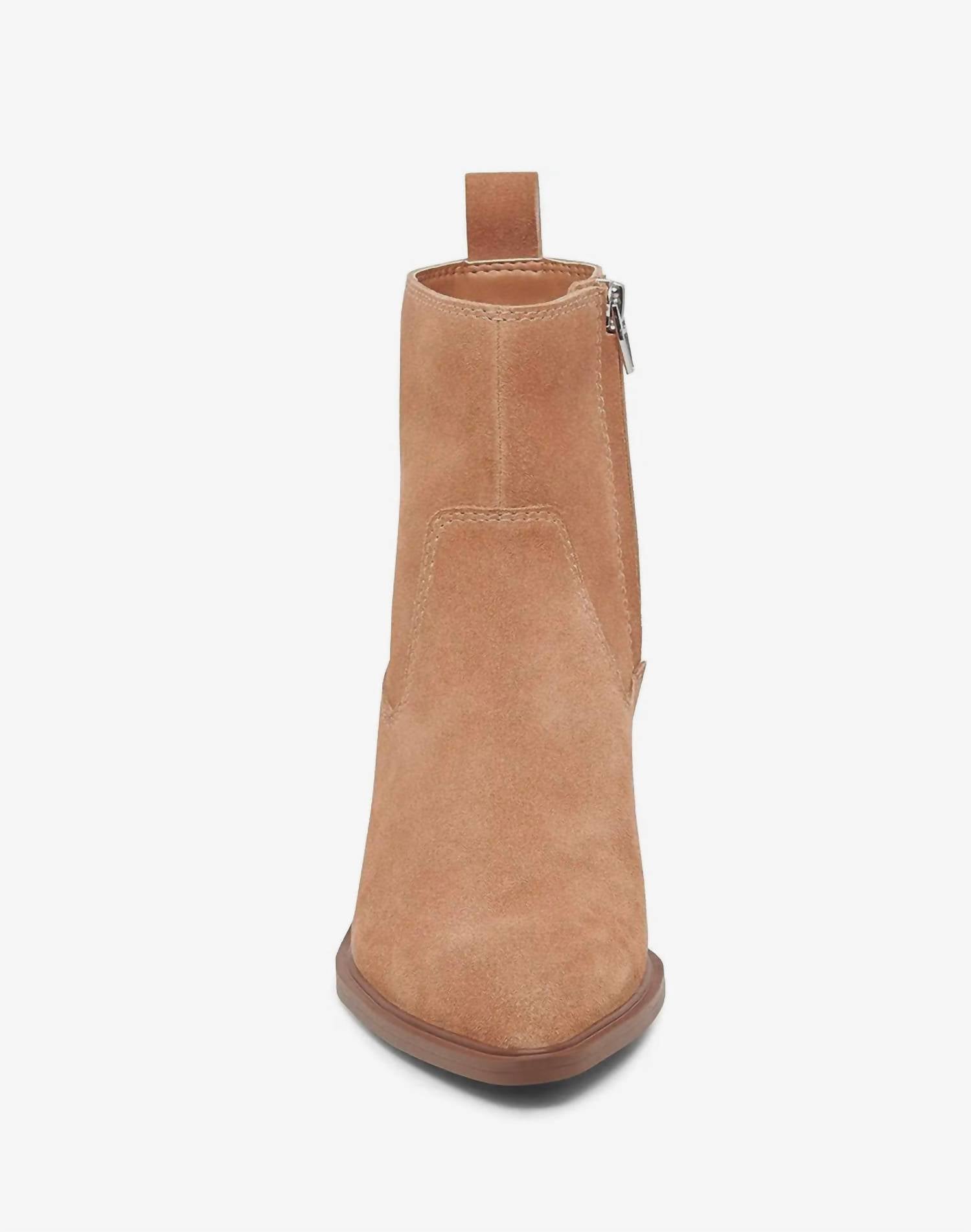 Say hello to the perfect, most versatile boot. The ankle height makes this style easily transition from day to night. Wear them with your favorite skinny jeans and tee for a more laid back look, or pair them with your favorite mini dress and jacket for a night out on the town. Step out in style with the BILI Boot by Dolce Vita, crafted for ultimate durability and elegance. Featuring a sleek pointed toe, this waterproof boot in Toffee Suede is made from a suede upper with a recycled synthetic outsole and lining, and a water-based leather alternative sock. With a 5.0" shaft height, an 11.0" leg circumference, and a 1.8" block heel, it offers a chic vintage look perfect for fall travel occasions. Imported and designed for women, the BILI Boot ensures you stay stylishly protected in any weather.