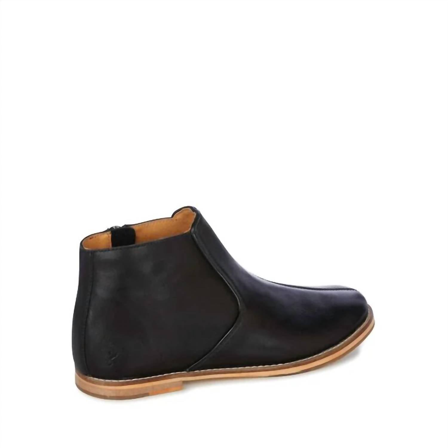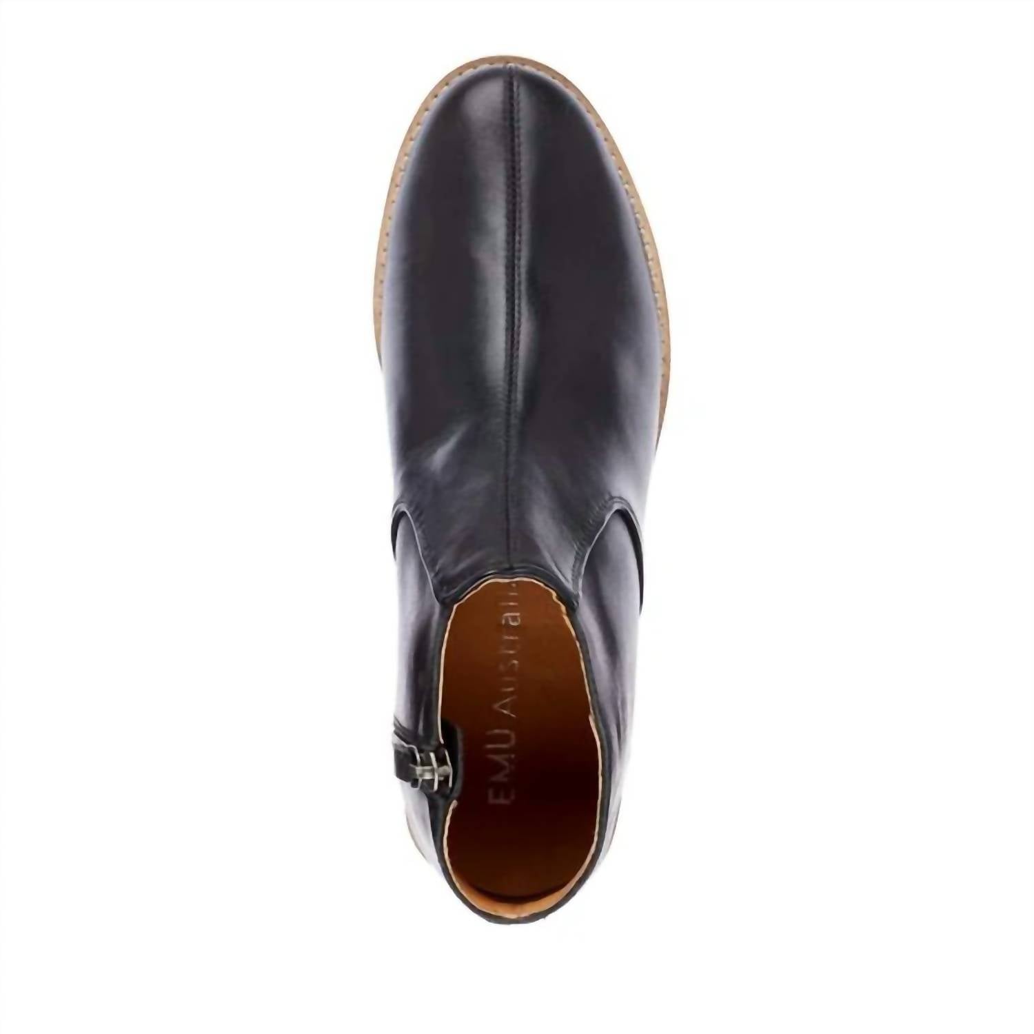 Introducing the Women's Kingston Bootie by EMU Australia, a versatile addition to your ankle boot collection in classic black. Crafted from soft leather, these booties feature an almond toe shape and a flat heel measuring 0.59 inches, perfect for all-day wear. The convenient medial side zip closure ensures easy on-and-off, while the timeless style seamlessly transitions from day to night. Ideal for both casual and dressy occasions, they offer a supportive and comfortable fit for women seeking style and comfort.