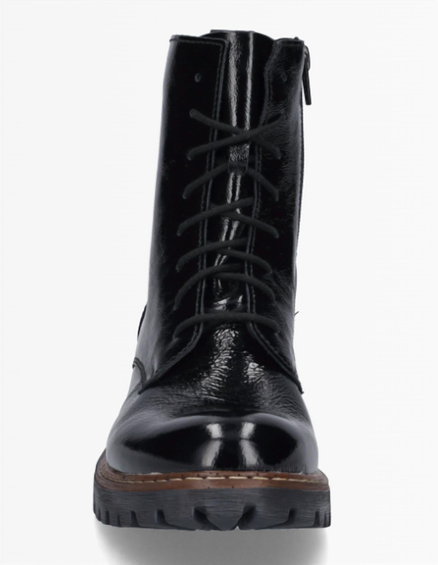 Say hello to the perfect, most versatile boot. The ankle height makes this style easily transition from day to night. Wear them with your favorite skinny jeans and tee for a more laid back look, or pair them with your favorite mini dress and jacket for a night out on the town. This stylish patent combat boot combines bold looks with all-day comfort. It features a cozy warm lining to keep your feet snug, an inside zip for easy on and off, and a chunky lug sole design with surprisingly lightweight construction. Supportive and comfortable, it's perfect for cold-weather wear with a touch of edge.