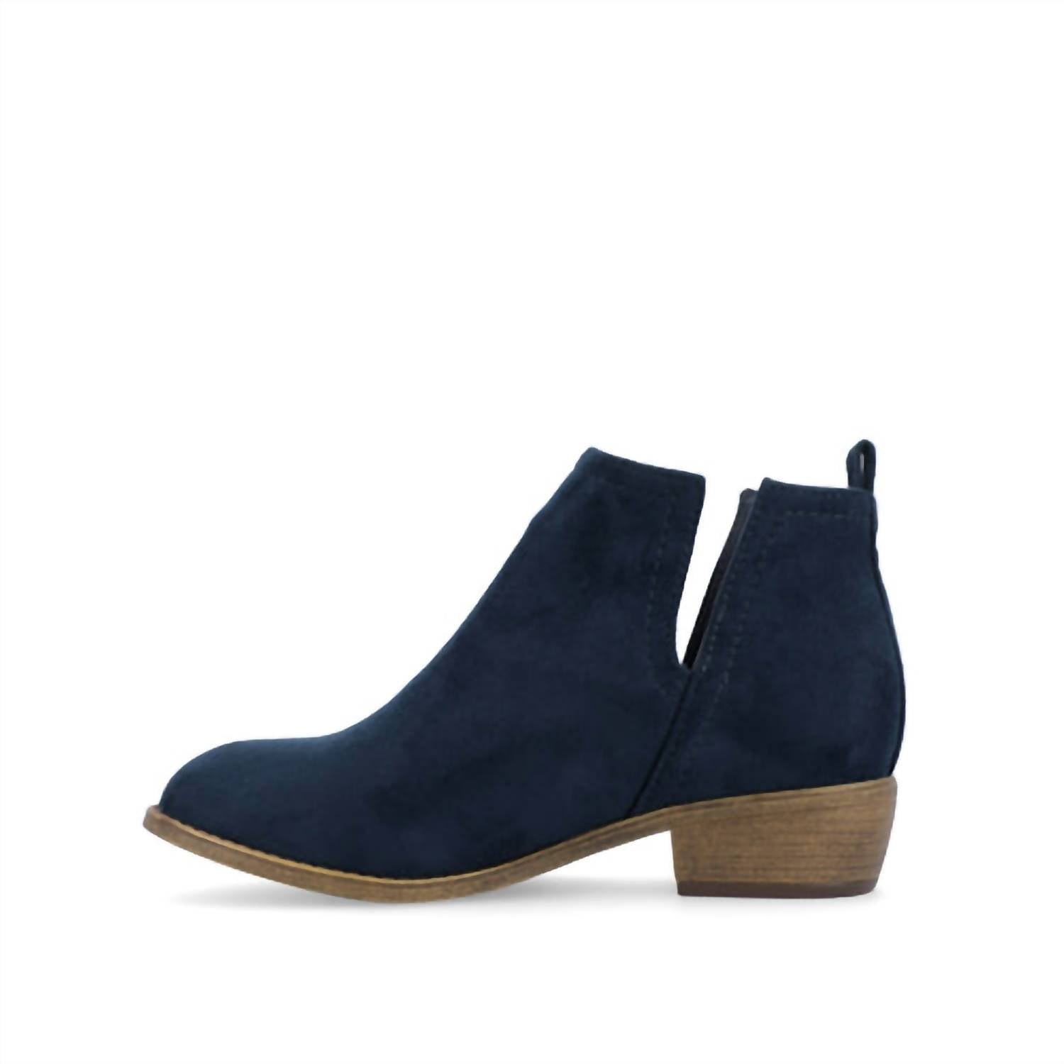 Say hello to the perfect, most versatile boot. The ankle height makes this style easily transition from day to night. Wear them with your favorite skinny jeans and tee for a more laid back look, or pair them with your favorite mini dress and jacket for a night out on the town. Step into chic sophistication with the Women's Regular and Wide Width Rimi Bootie by Journee Collection. Crafted in blue faux suede, these ankle booties boast a stylish side split design and a comfortable padded footbed. They feature a 1 1/2-inch stacked block heel and a medium shoe width for a snug fit. The pull-on closure pairs effortlessly with a round toe style, while a 5-inch shaft height and 9-inch top circumference complete the look. Lined with fabric and crafted with a man-made outer sole, they promise both comfort and durability.