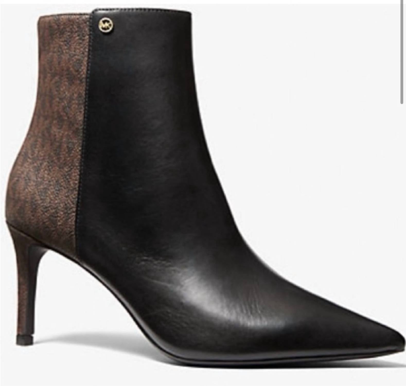 Say hello to the perfect, most versatile boot. The ankle height makes this style easily transition from day to night. Wear them with your favorite skinny jeans and tee for a more laid back look, or pair them with your favorite mini dress and jacket for a night out on the town. Elevate your Fall wardrobe with the Women's Alina Flex Pointed Toe Logo Booties by Michael Kors, an embodiment of quiet luxury for your dinner parties. Featuring a sleek pointed toe and stiletto heel, these ankle boots come in a classic black and brown signature print. Made from premium leather, these booties are designed with a side zipper closure for easy wear and approximately 3" wrapped heel for added elegance. A perfect blend of style and sophistication, ideal for adult women looking to make a statement.
