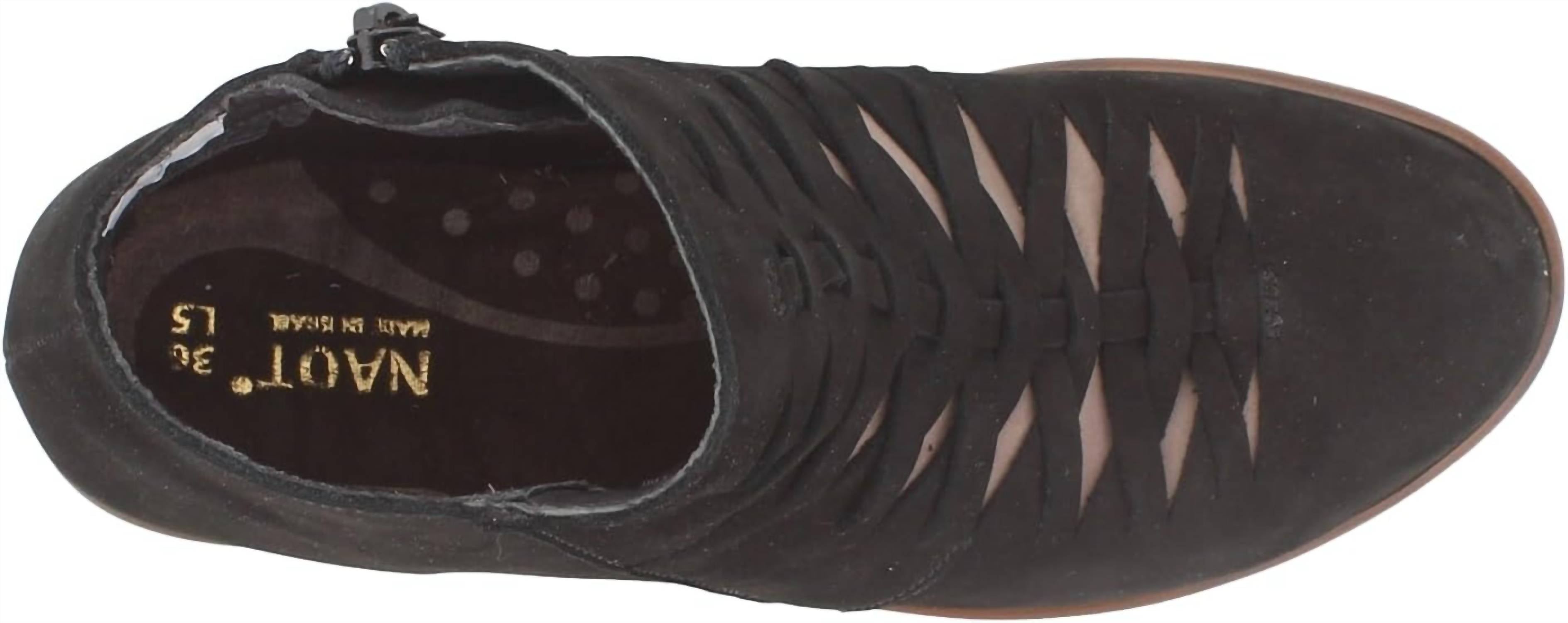 Say hello to the perfect, most versatile boot. The ankle height makes this style easily transition from day to night. Wear them with your favorite skinny jeans and tee for a more laid back look, or pair them with your favorite mini dress and jacket for a night out on the town. Step into effortless style with the Women's Leveche Boot by NAOT, featuring a menswear-inspired oxford silhouette in sleek black. Crafted from premium leather with perforated seams, this bootie offers both fashion and function. Experience the comfort of a removable, anatomic cork and latex footbed wrapped in microfiber and leather, perfectly molding to your foot. Made in Israel, the slip-resistant polyurethane outsole ensures stability with every step, ideal for a spring dinner party.