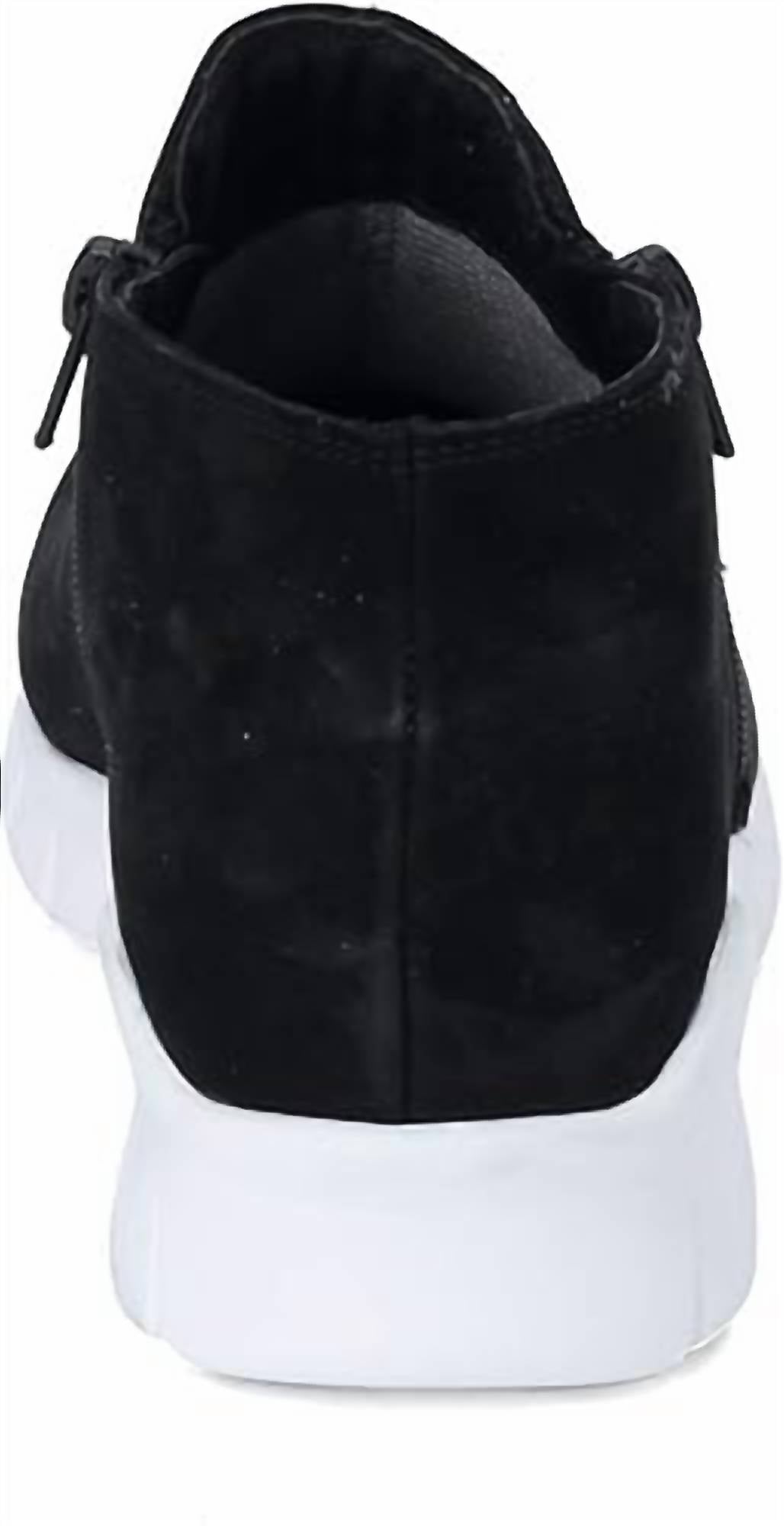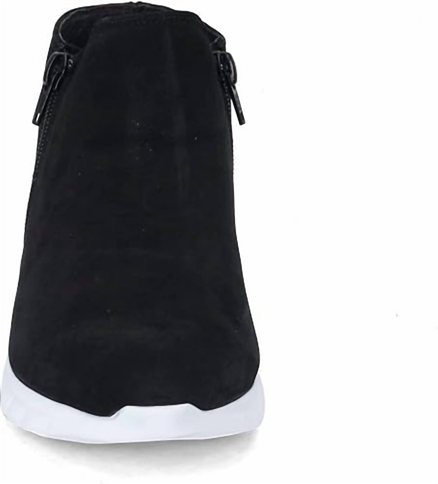 Introducing the Women's Zodiac Shoe by NAOT, a sleek option in classic black nubuck designed for comfort and style. Equipped with a 1.5" low flat heel, this ankle bootie features a polyurethane slip-resistant sole and a round toe shape. The Zodiac boasts a cork and latex removable footbed, ensuring orthotic-friendly support, and includes double zippers for easy wear. Recognized by the American Podiatric Medical Association (APMA) for promoting good foot health, this shoe is perfect for both travel and minimalist winter occasions.