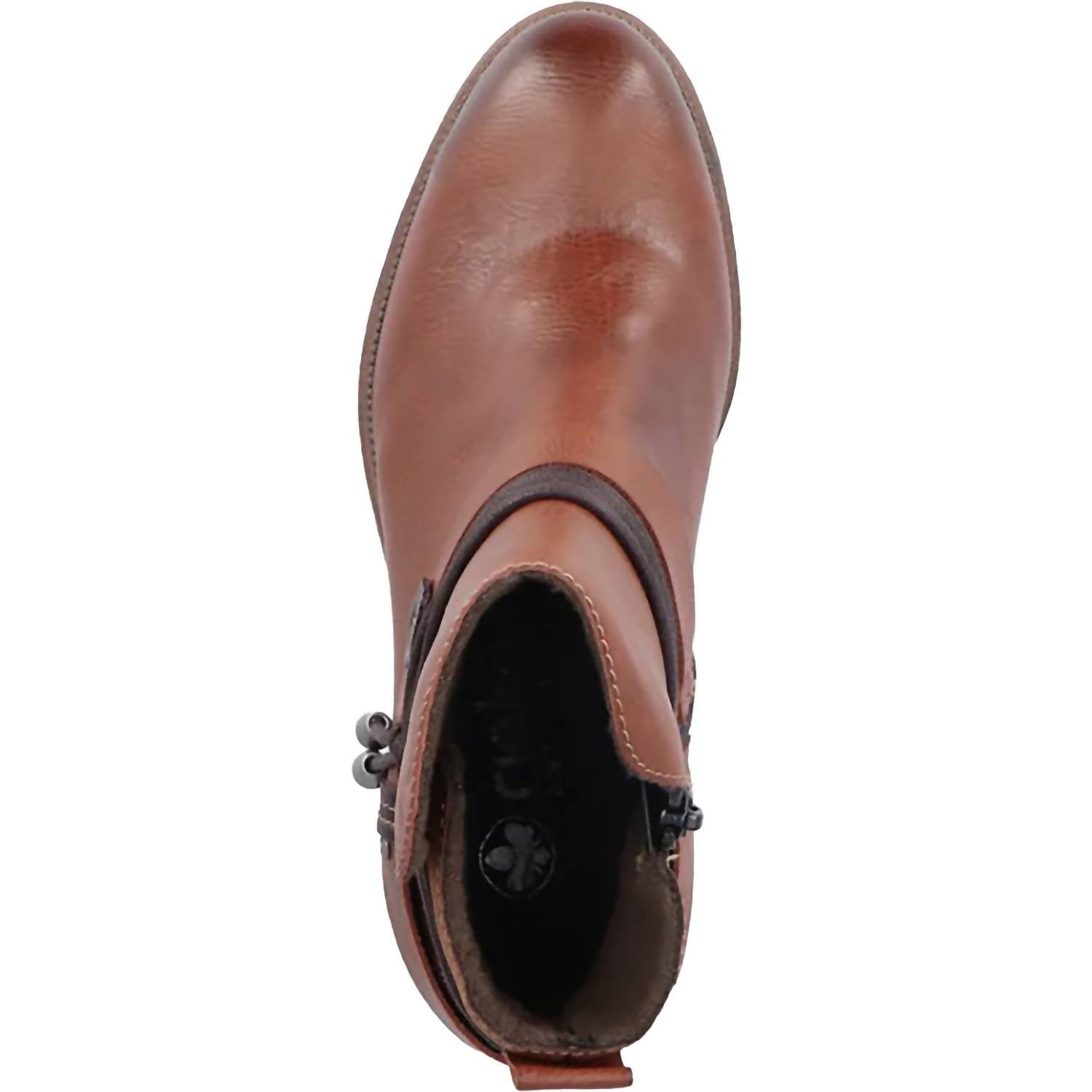 Say hello to the perfect, most versatile boot. The ankle height makes this style easily transition from day to night. Wear them with your favorite skinny jeans and tee for a more laid back look, or pair them with your favorite mini dress and jacket for a night out on the town. Step into style with the Women's Kylie 80 Ankle Boots by RIEKER, featuring a chic blend of muskat, brandy, and havanna colors. These ankle boots are crafted from durable faux leather, finished with a functional zipper closure for easy wear. Enjoy a comfortable 2.2" block heel that offers both style and all-day comfort, complemented by a thermoplastic elastomer outsole for reliable traction. Perfect for fall dinner parties, these boots add a fashionable touch with their trendy cord detail and are a nod to 90s fashion.