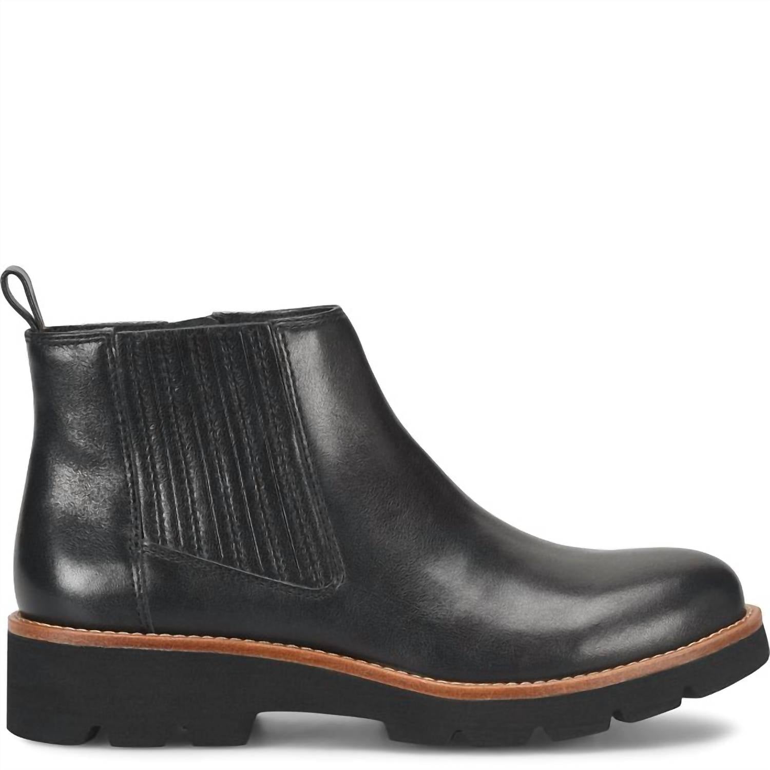 Say hello to the perfect, most versatile boot. The ankle height makes this style easily transition from day to night. Wear them with your favorite skinny jeans and tee for a more laid back look, or pair them with your favorite mini dress and jacket for a night out on the town. Introducing the Women's Paige Boots by Sofft, where functionality meets fashion. These black Chelsea boots from the AQUA Söfft collection feature waterproof full-grain and Italian leathers for superior wet-weather protection. The boots are equipped with a slip-resistant, rubber-EVA blend lugged outsole, a hidden stretch goring panel, and an inside zipper with a leather pull for easy wear. Enjoy comfort with the soft microfiber lining and leather-lined footbed, cushioned at the ball and heel, with arch support, all resting on a low 1.5-inch chunky heel. Designed with a stylish almond toe shape, these boots promise both comfort and style for any adventure.