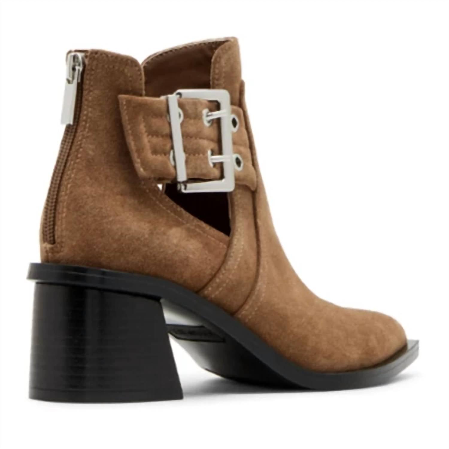 Features a suede upper with bold buckled strap detail and a back zipper closure. Synthetic lining and outsole. 4" boot shaft height, 12" shaft circumference, and 2.5" heel height.