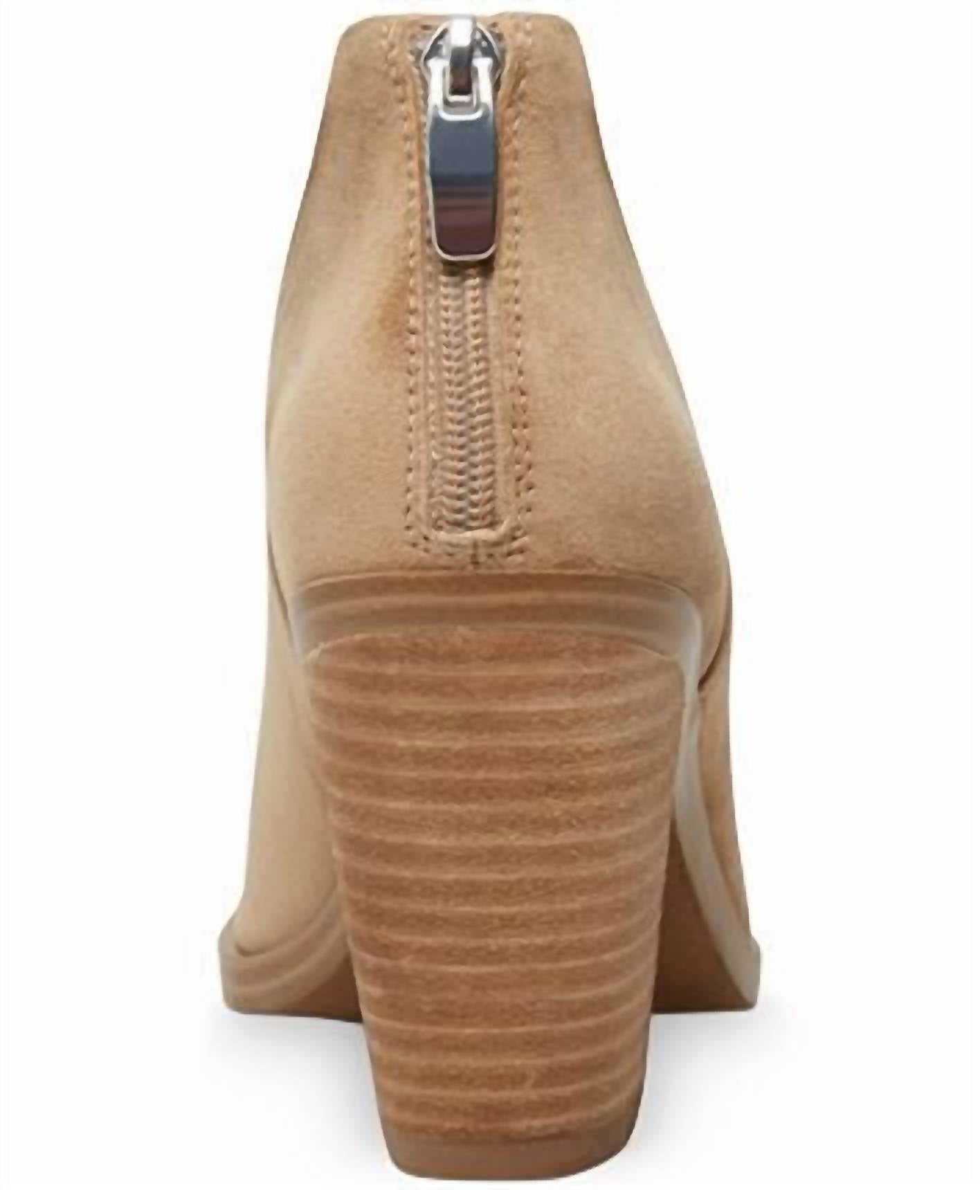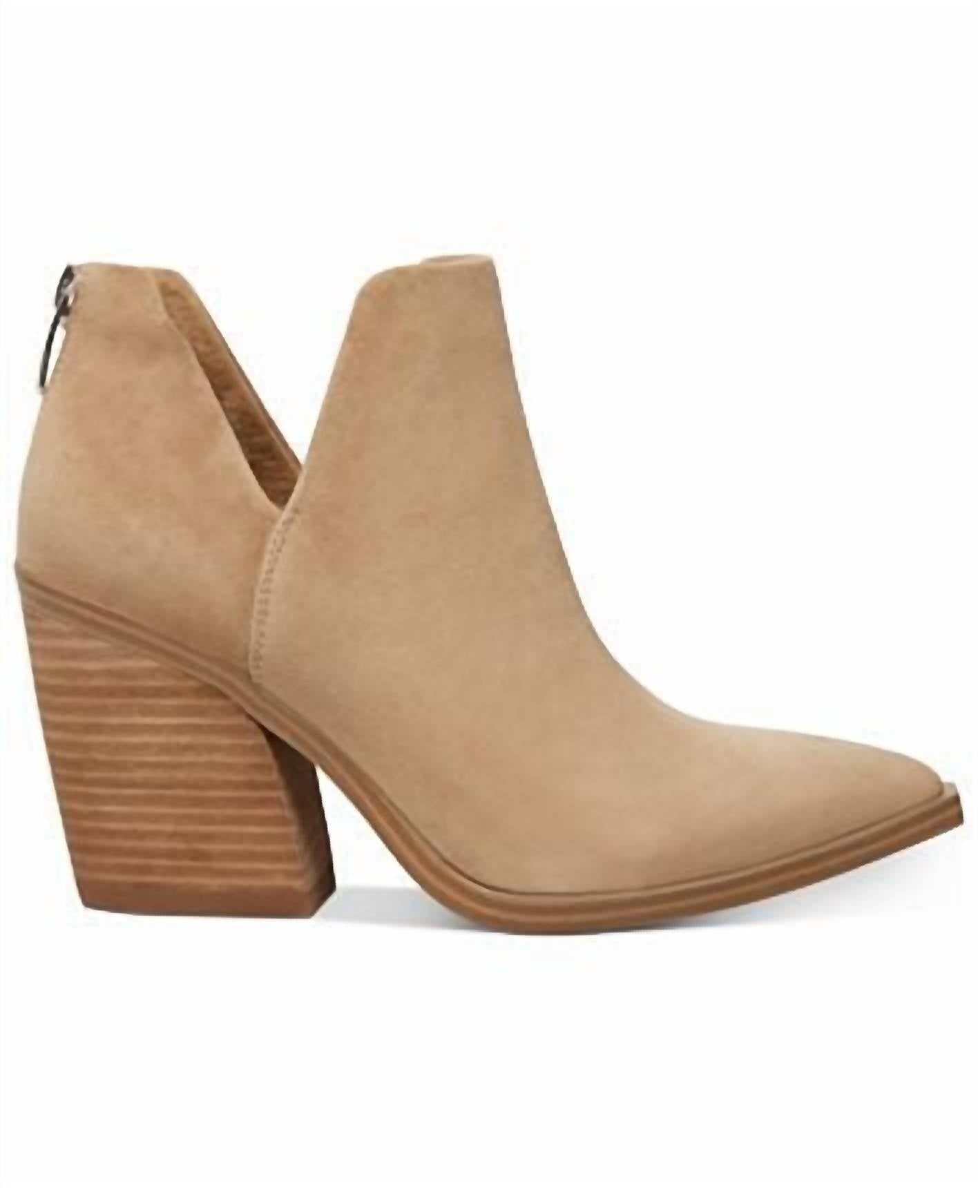 Step into sophisticated style with the Women's Suede Ankle Vnotch Boots by Steve Madden in tan. Featuring a high 3 3/4" block heel, these boots boast a pointed toe and stylish side cutouts. With a convenient back zipper for easy closure, they are perfect for adding a chic touch to your spring outfit. Crafted from premium suede, these boots are a must-have for any fashion-forward wardrobe.