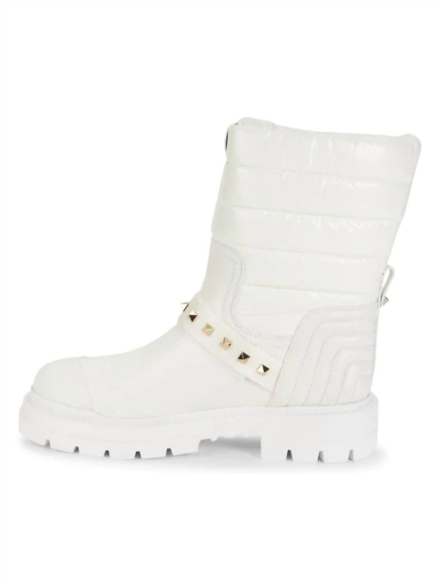 Step into sophistication with the Women's Calfskin Leather Ankle Boots by Valentino Garavani in Whisper White. Made in Italy, these boots boast a premium calf leather upper and a leather and fabric lining, complemented by a faux-buckle fastening. The iconic platinum-plated pyramid studs accentuate the design, offering a striking silver-toned finish that enhances their round toe and block heel silhouette. Perfect for the fall season, these boots feature a leather insole and durable rubber sole, ensuring both luxury and functionality.