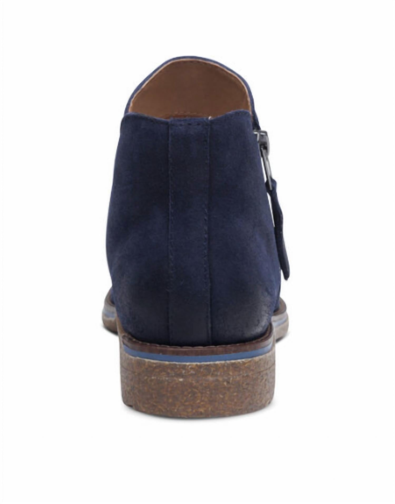 Upgrade your shoe game with these classic heeled boots, designed to merge sophistication and style. Comfortable enough for long days or a night out on the town. Step into style with the Women's Mila Boot by Aetrex, a fall essential in trendy Western design. Crafted from weatherproof genuine leather in a deep navy shade, these ankle boots feature a chic ruched vamp and are finished with a chunky 1.25" heel. They're designed with a convenient side zipper and stretchy gore for excellent adjustability and fit. Boasting a durable rubber outsole, lightweight cork midsole, and removable insole, these boots offer superior arch and underfoot support, perfect for camping adventures.