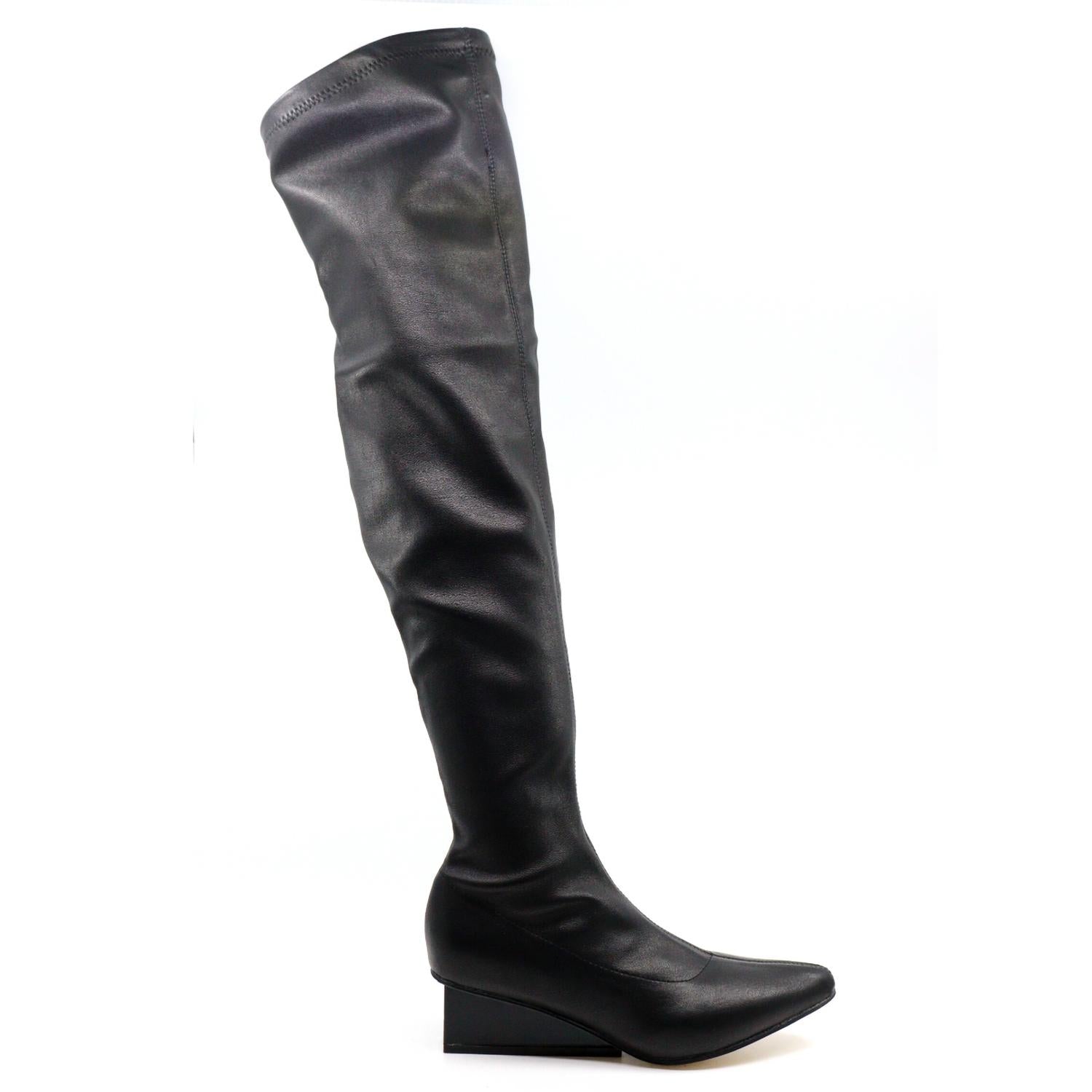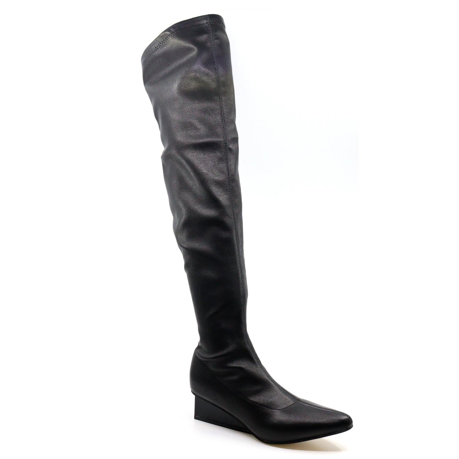 These over the knee boots are equal parts classic and cool.Step out in unparalleled elegance. Exquisite over the knee boots. Epitome of sophistication and flair. Crafted in Italy from top-quality materials. Offer a luxurious soft and flexible feel that ensures supreme comfort with every stride. Innovative new narrow square wedge. Adorned in a subtle black sheen. Adds a contemporary edge to this classic silhouette. Redefine your style with these stunning boots. Embrace the perfect blend of Italian craftsmanship and modern design.