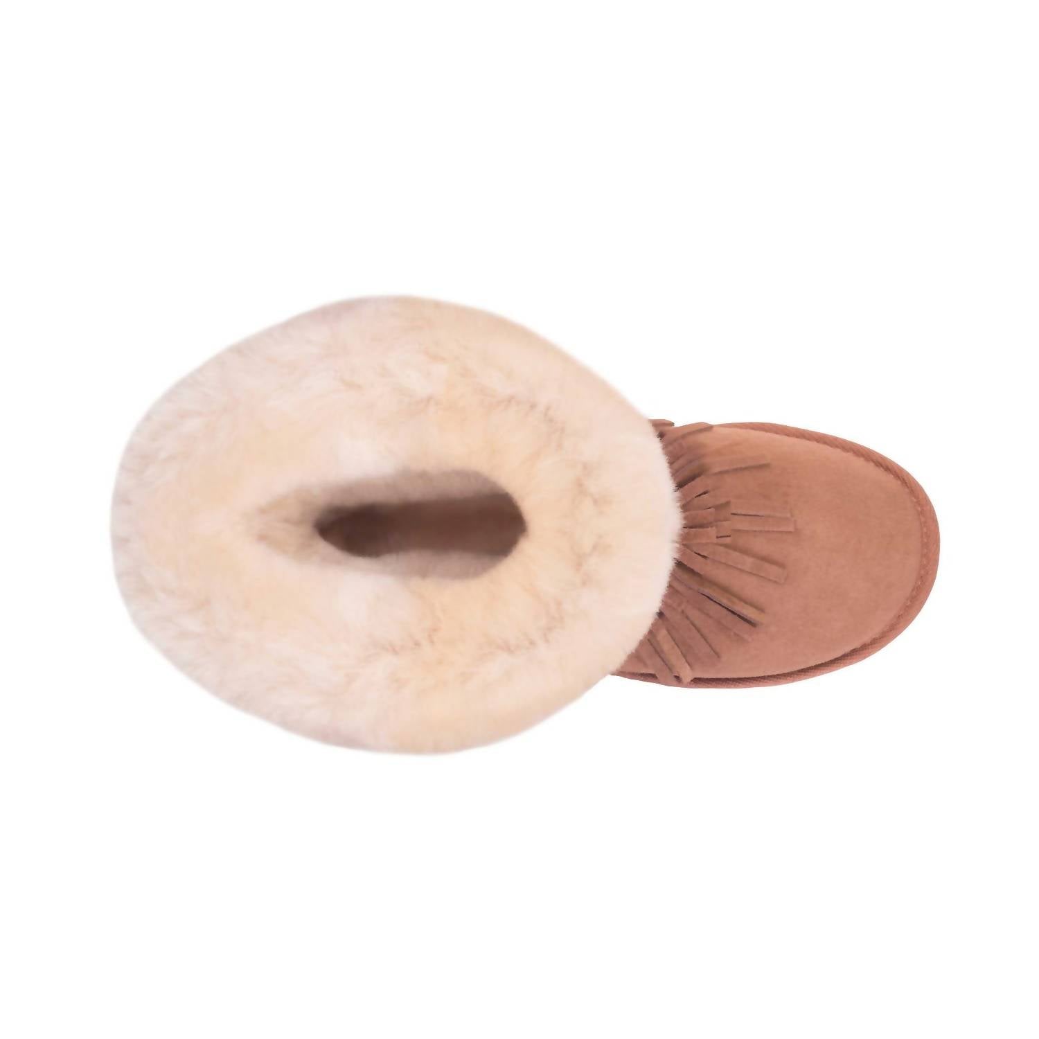 Embrace winter with the Women's Classic Fringed Sheepskin Boot by CLOUD NINE in a warm chestnut hue. These calf-high boots feature 100% genuine sheepskin lining and an upper made from double face sheepskin, promising both comfort and style. The durable sole is crafted from EVA/TPR, ensuring stability and longevity. Experience ultimate coziness and timeless fashion with these must-have winter essentials.