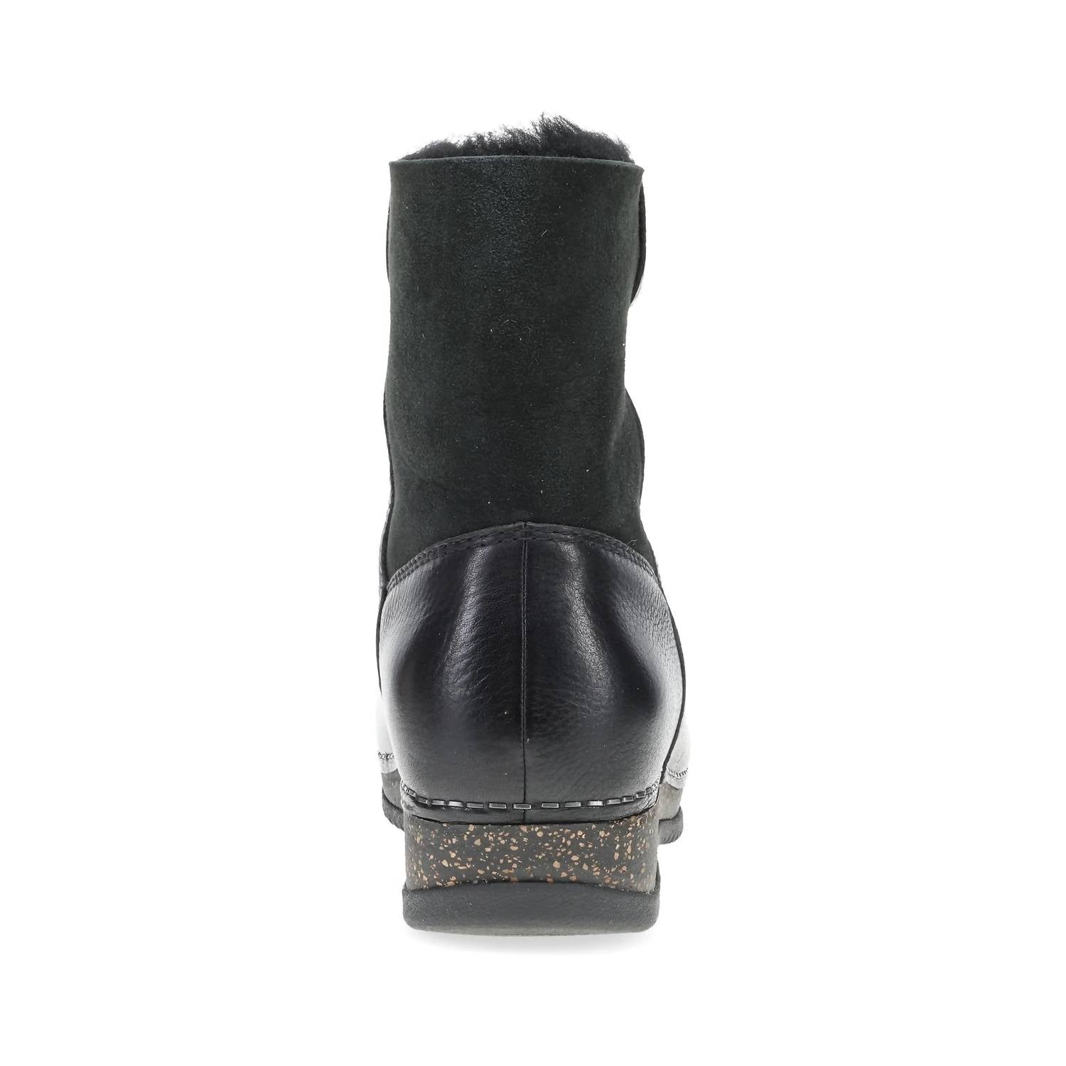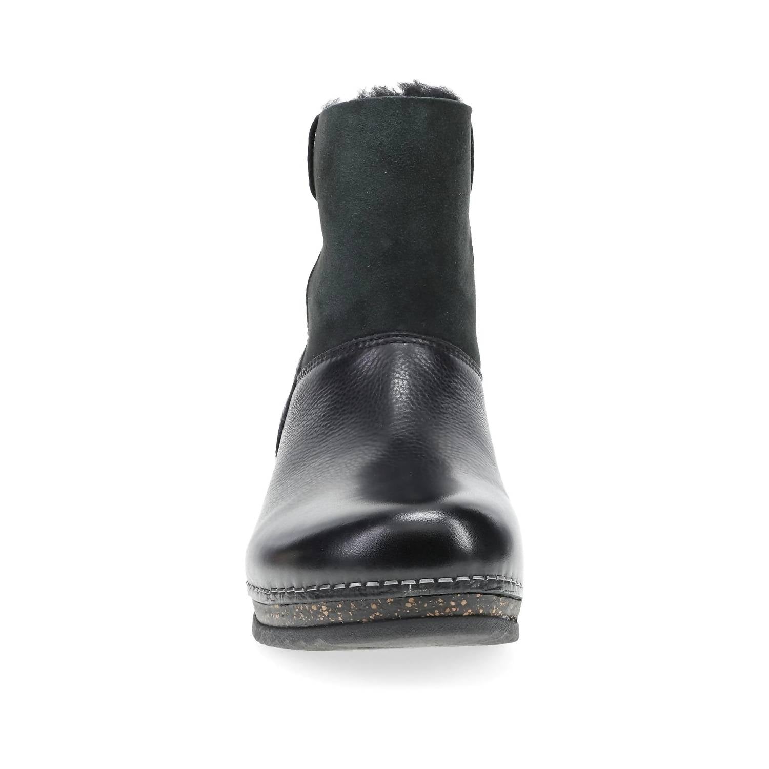 Say hello to the perfect, most versatile boot. The ankle height makes this style easily transition from day to night. Wear them with your favorite skinny jeans and tee for a more laid back look, or pair them with your favorite mini dress and jacket for a night out on the town. Step into winter with the Women's McKenzie Waxy Milled boots by Dansko, blending style and functionality in a sleek black design. Crafted with high-quality leathers, these ankle boots feature a shearling-lined shaft and a dual-density cork/EVA midsole for ultimate warmth and comfort. The patented stapled construction ensures durability, while the lightweight rubber outsole promises long-lasting wear. Ideal for travel and winter occasions, these boots keep feet cozy and odor-free, thanks to the 100% recycled textile lining.