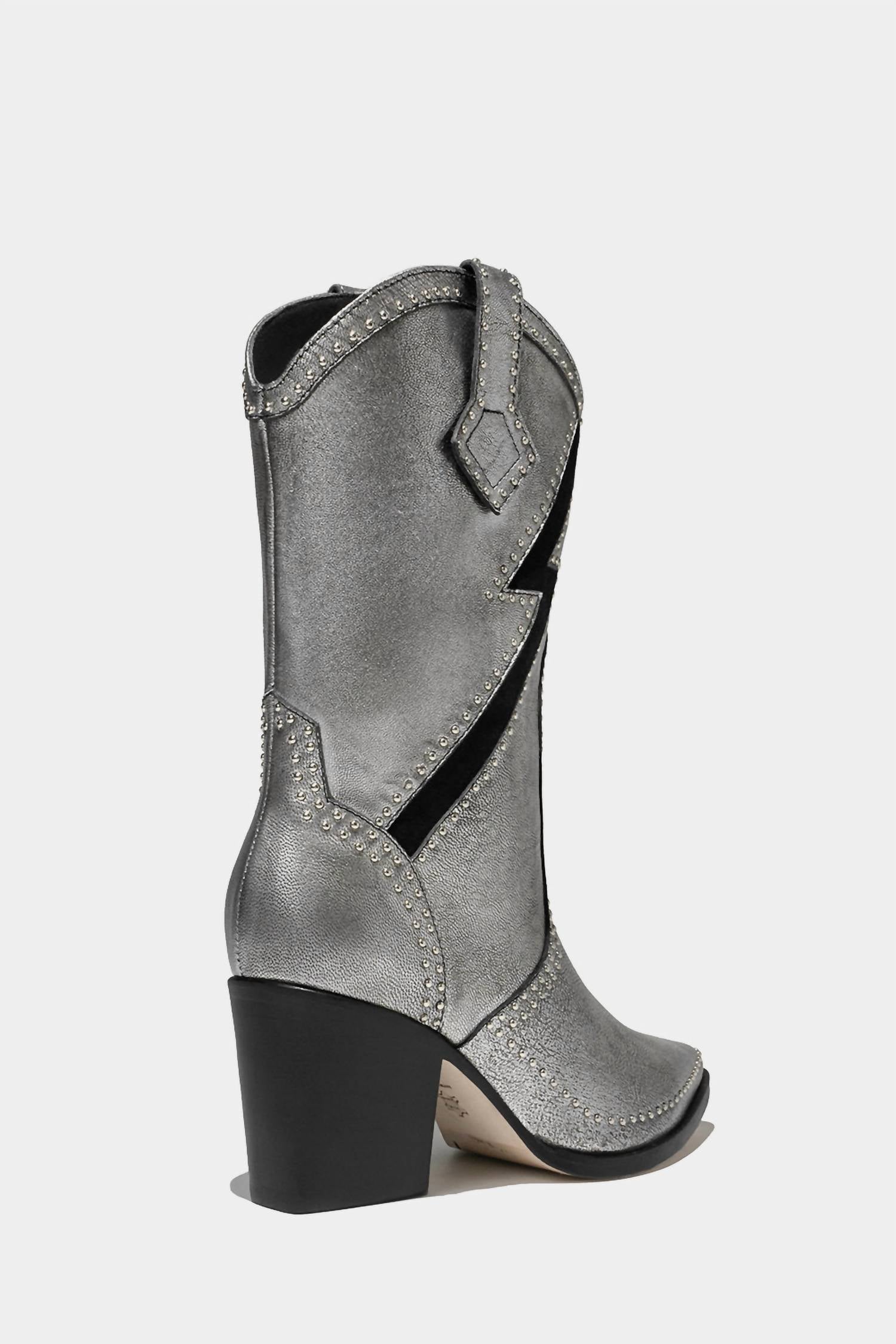 Step out in confidence and showcase your impeccable taste with these fashionable and versatile boots. Their classic style will have you reaching for these boots season after season. Step into the spotlight with the Women's Freddie Leather Boots by Dante Shoes, inspired by classic rock music. These metallic silver heeled boots are crafted from 100% high-quality leather, offering both a bold look and extra comfort with their soft leather lining and Comfortech insole. Designed with a pointed toe and block heel, with a mid-height ranging from 2 1/4" to 3", these boots are the perfect choice for music festivals and trendy Y2K style. Embrace sophistication and make a striking statement wherever you go.
