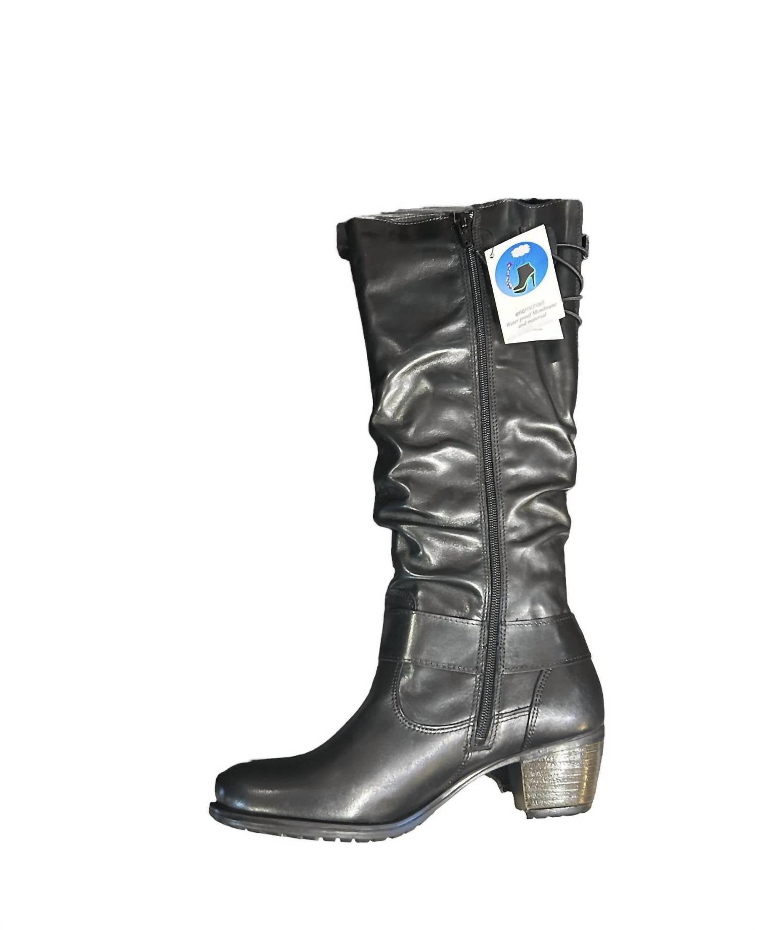Step out in confidence and showcase your impeccable taste with these fashionable and versatile boots. Their classic style will have you reaching for these boots season after season. These slouch waterproof boots combine style and practicality with a short stacked heel and lug sole for traction. The waterproof leather upper keeps feet dry, while a light fleece lining adds softness and warmth. Stretch elastic goring on the calf ensures a comfortable fit for a variety of calf sizes, and an elastic detail across the gore enhances both design and function. The boots feature a 1.5-inch stacked heel for subtle lift and a durable lug rubber outsole for reliable grip.
