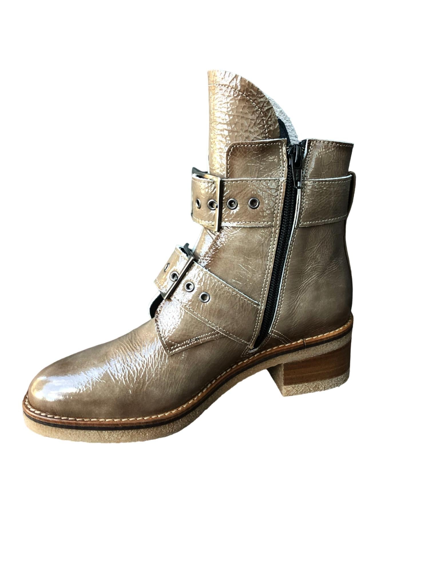 Upgrade your shoe game with these classic heeled boots, designed to merge sophistication and style. Comfortable enough for long days or a night out on the town.Step into versatile style and all-day comfort with the Eric Michael Justina boots, designed to seamlessly blend practicality and fashion-forward design. Featuring a luxe patent leather upper, these taupe beauties exude an effortless charm perfect for your bustling lifestyle. The inside zipper is cleverly paired with wrap buckle closures, providing both structure and a touch of edgy sophistication. The smooth textile lining ensures a snug fit, while the lightly cushioned footbed offers a gentle massage with every step, making these boots your go-to for busy weekends and on-the-go days. The low-profile heel adds just the right amount of lift, and the lightweight yet durable synthetic outsole effectively minimizes shock and vibration, keeping you comfortable all day long. Whether you're dressing up or down, the Eric Michael Justina boots are the perfect companions for any adventure. Imported with meticulous craftsmanship, these boots promise to elevate your wardrobe with both style and comfort. Heel Height: 1.25".