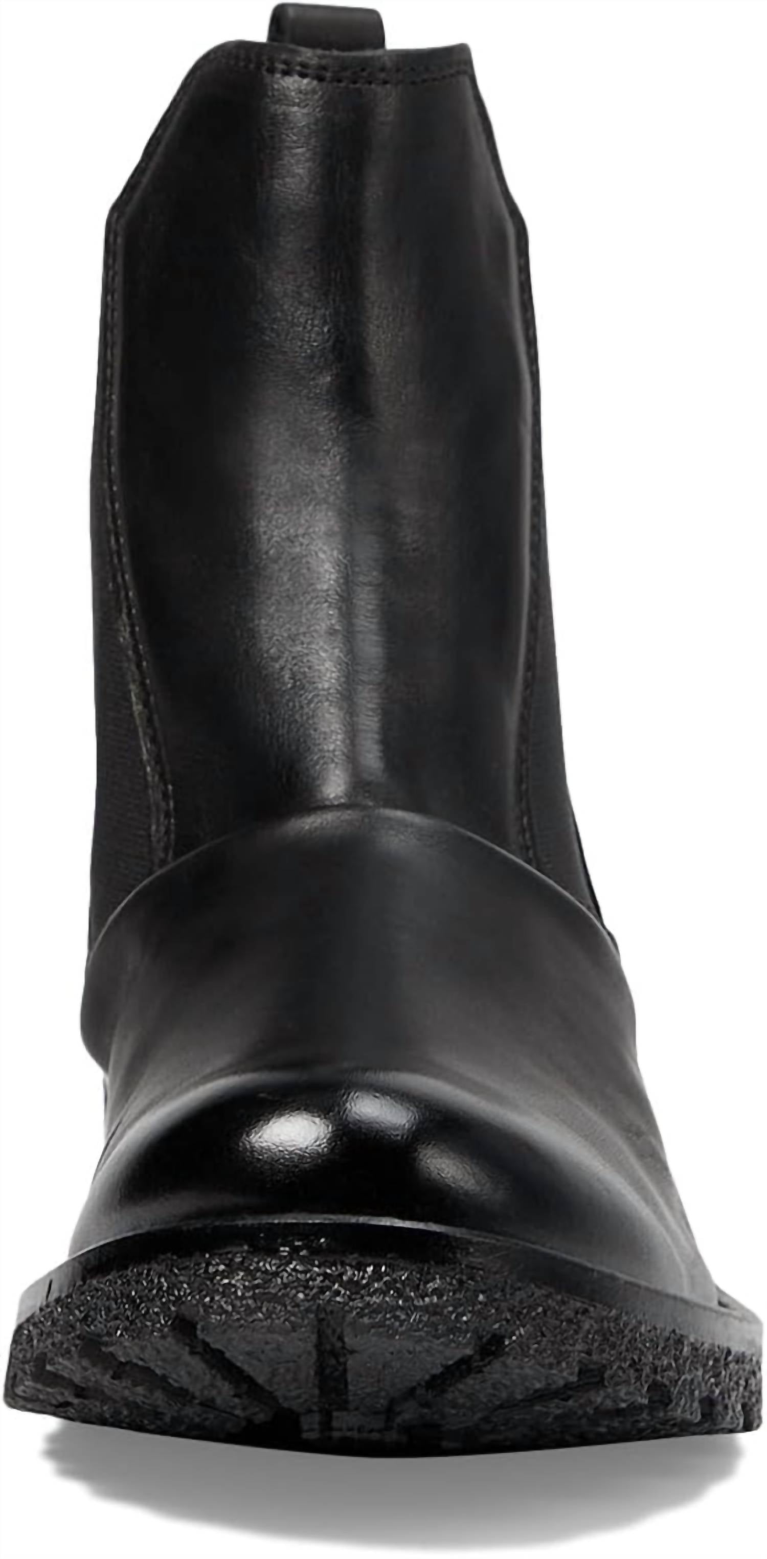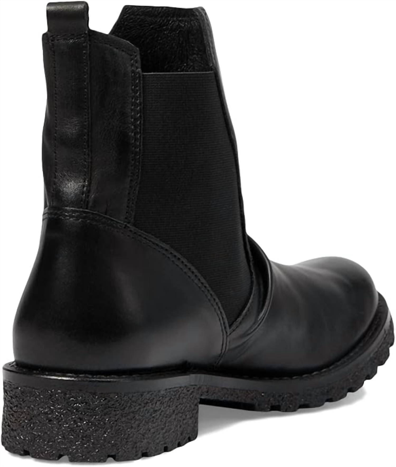 Introducing the Women's Shoe Cruz Boot by Eric Michael, a stylish ankle bootie designed for versatility in sleek black. This pull-on boot features deep elastic panels and a convenient leather tab for easy wear, with a round toe and a chunky heel. The heel rises to an elegant 1.25 inches, providing just the right amount of lift. Made in Portugal, this boot is crafted for enduring style and comfort with a gum lug sole.