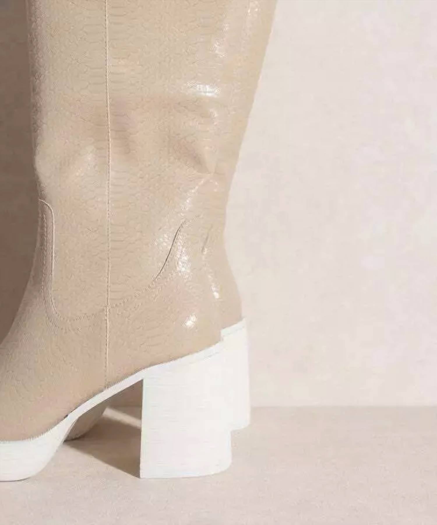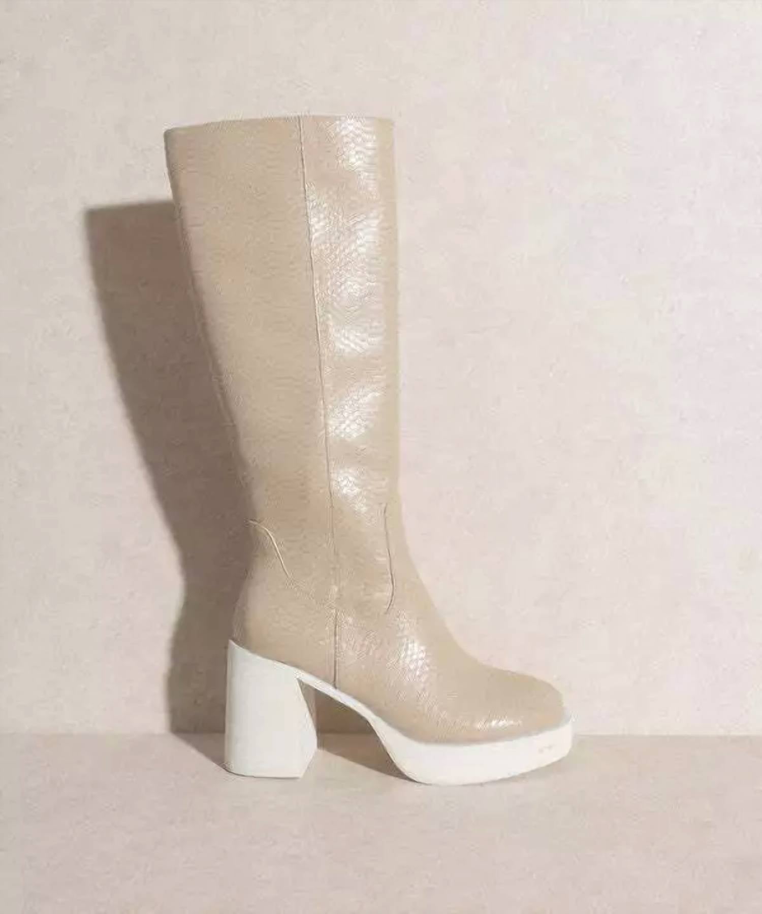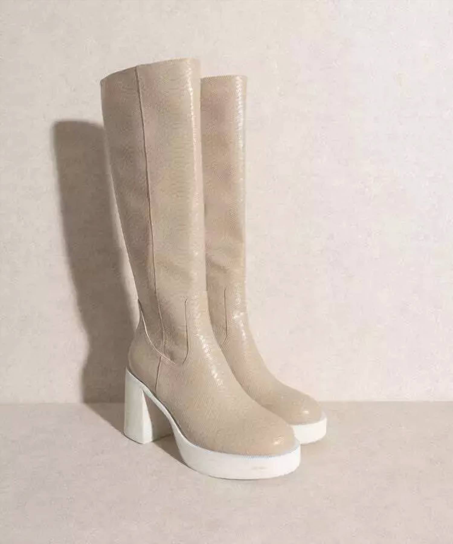 A stylish boot with a comfortable fit and the perfect amount of height. These classic boots are the perfect addition to any outfit and can be worn season after season. Step out in style with the Women's Juniper High Boots by KKE Originals, a chic addition to any wardrobe. Crafted from premium leather, this beige boot features a tall, slim-cut silhouette with a shaft height of 14.75" and a commanding heel of 3.5" for a striking look. The round toe and chunky heel enhance comfort, while the side zipper closure ensures ease of wear. Care for these boots with a soft cloth and lukewarm water, adding a touch of mild soap if necessary, and remember to store them in a dry place.