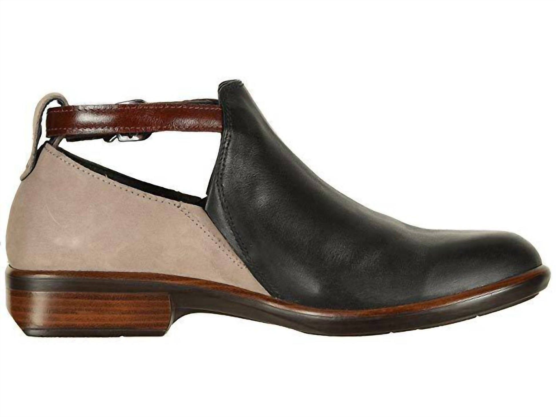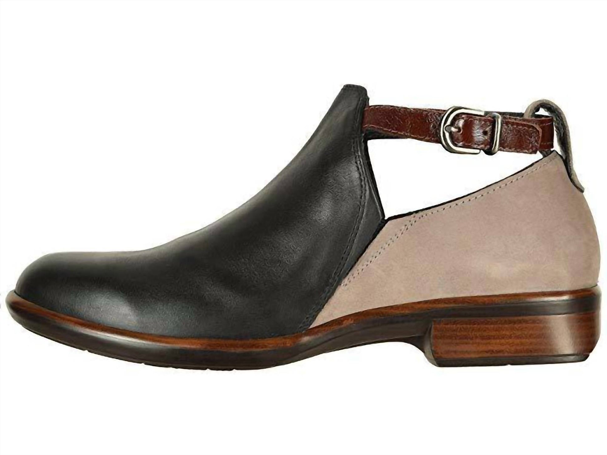 Experience the unique elegance of the Women's Kamsin Stone Luggage Boot by NAOT, designed with jet black leather and suede uppers. These ankle boots feature stylish side cutouts with hidden goring and a round toe for a minimalist look. The adjustable buckle closure ensures a comfortable fit, while the cushioned footbed offers added support. Made with a modest stacked heel and durable man-made outsole, these boots are imported and perfect for a fall dinner party.