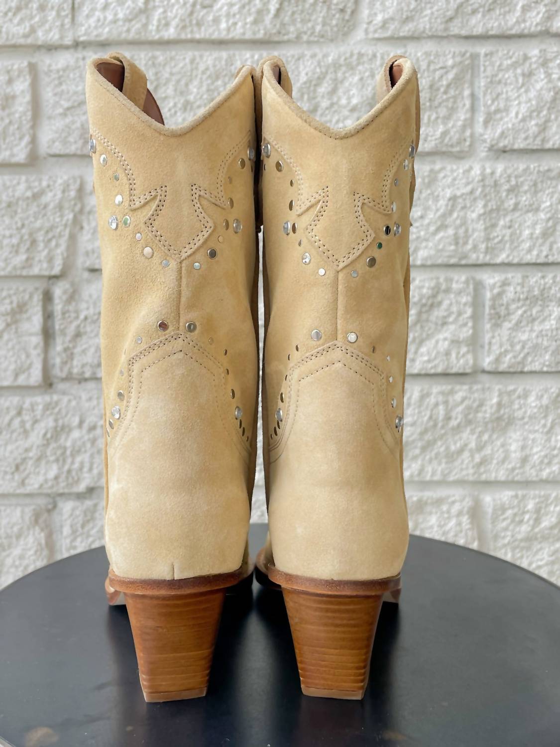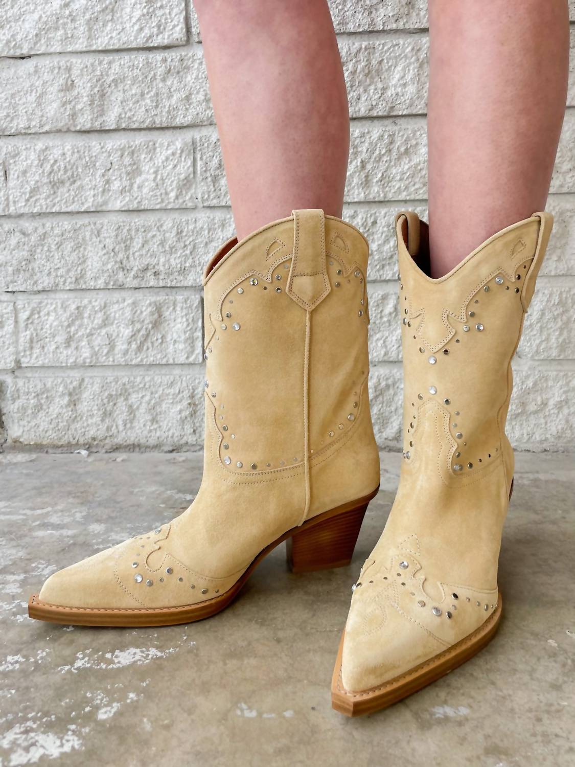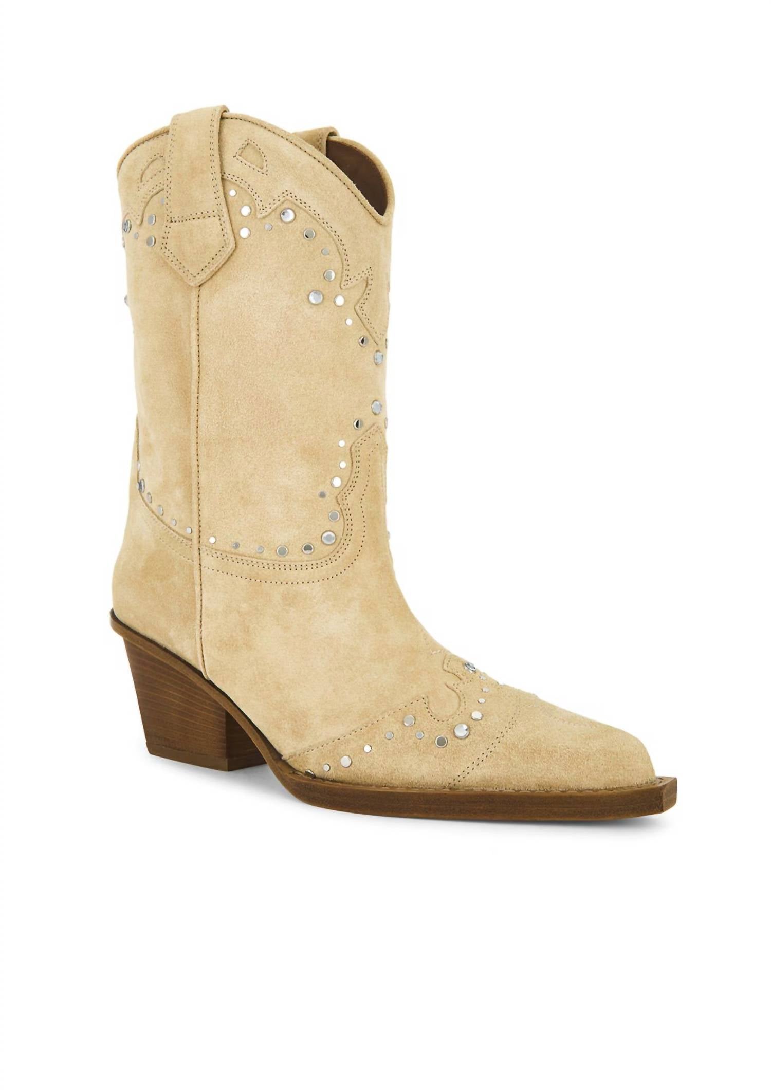A trend that is here to stay. Step into style with the Women's Janice Suede Cowboy Boots by Paris Texas, crafted for both comfort and flair. These ecru boots showcase exquisite Western-style embroidery adorned with rhinestones and silver studs, perfectly capturing the trend of the season. Made from 100% calf suede, they feature a pointed toe and are finished with a chunky 2.5-inch mid heel. Originating from Italy, these over the knee boots are designed for chic summer concerts or Thanksgiving occasions.