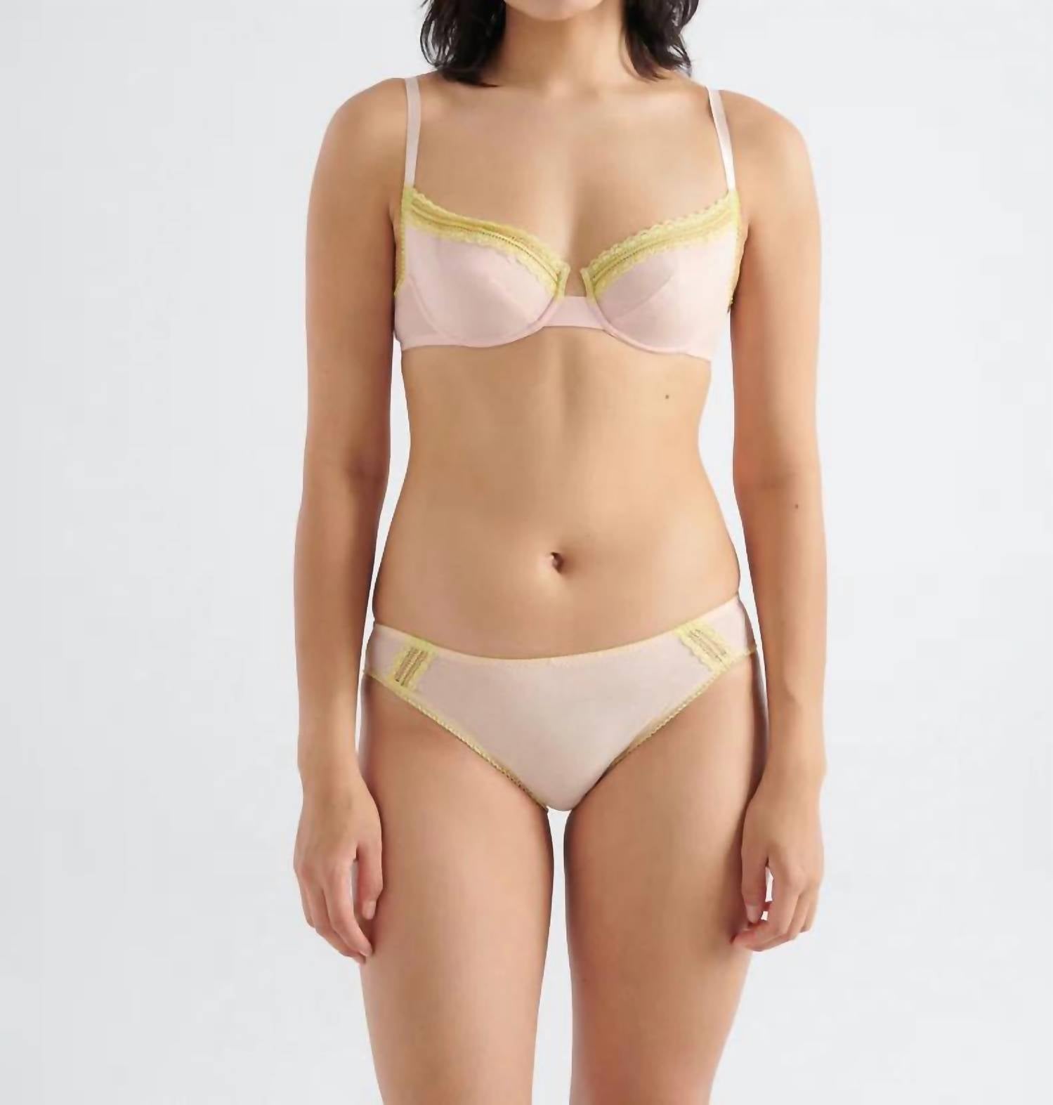 Introducing the Chloe Underwire Bra by Araks, an exquisite choice for women seeking quiet luxury in their summer wardrobe. This bra is crafted from 100% Cotton Crepe and features delicate contrast lace trim in the brand's signature color pairings. Made in the USA, it includes a shiny silk charmeuse center with darts that enhance your natural curves. For care, it is recommended to hand wash in cool water and air dry, avoiding high heat to preserve the fabric and elastic integrity.