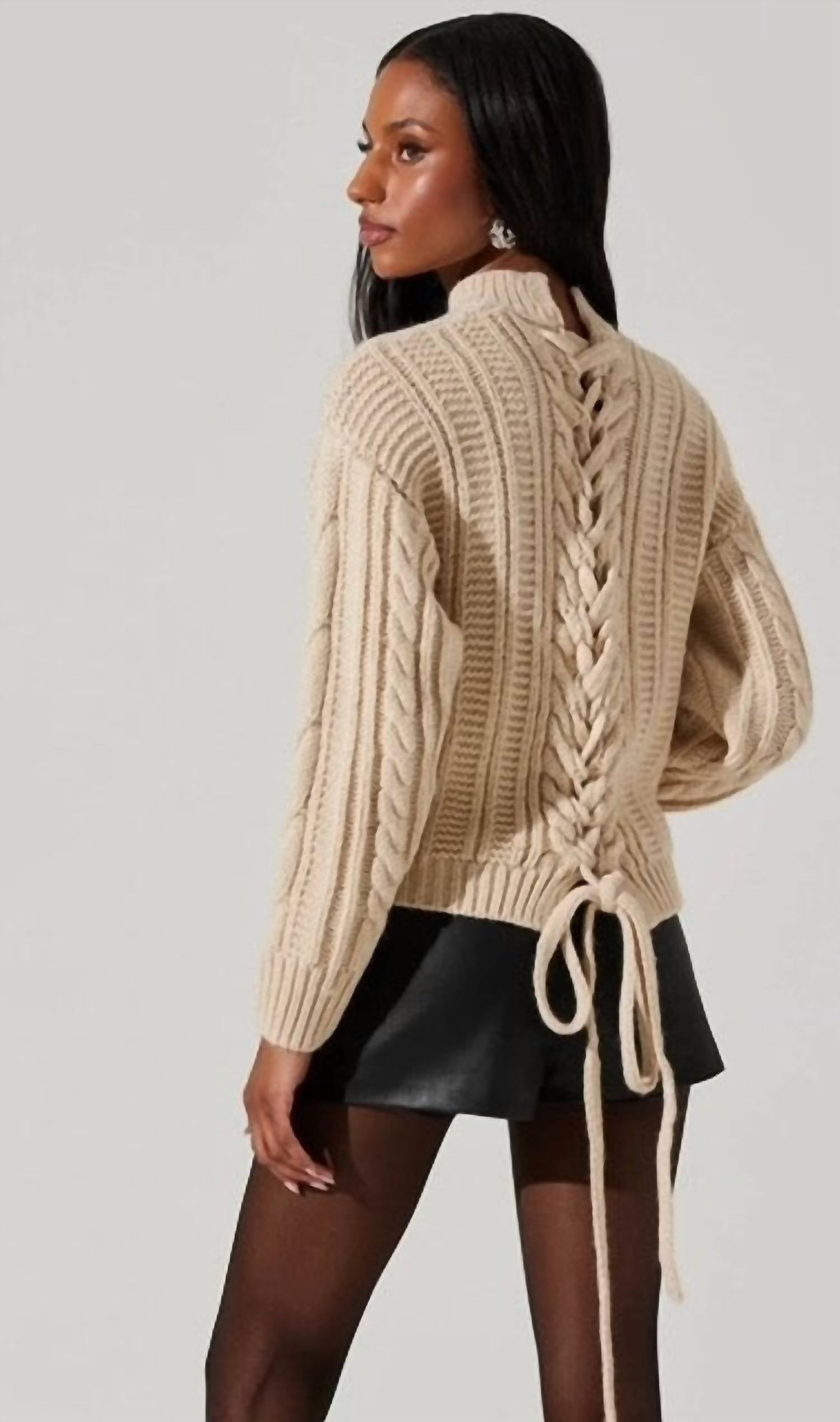 Introducing the Tie Back Sweater by ASTR, a minimalist winter essential for your vacation wardrobe. This cream-colored piece features long sleeves and a sophisticated lace-up tie back closure, enhancing its modern elegance. Crafted from 77% Acrylic, 9% Nylon, 8% Wool, and 6% Polyester, it offers a flattering fit with timeless texture. Care: Dry clean only, ensuring lasting quality and comfort.