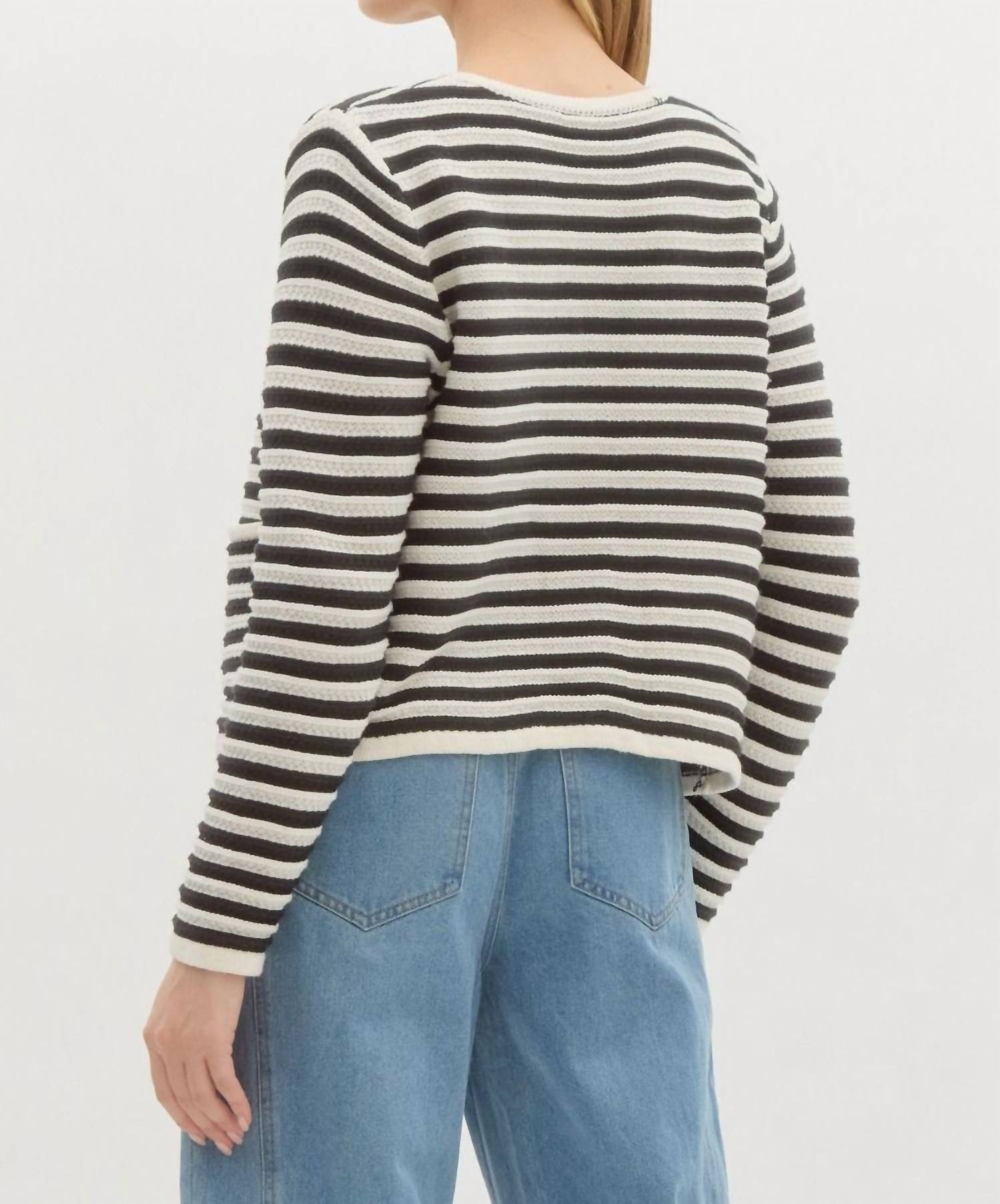 Enhance your wardrobe with the Striped Cardigan by Entro, featuring a chic black and cream color palette. This women's cardigan showcases a round neck design with long sleeves, crafted from a comfortable 60% cotton and 40% acrylic knit blend. Gold button front closure adds a touch of elegance, complemented by practical patch pockets. Ideal for effortless styling, this lightweight piece doesn't require specific care instructions.