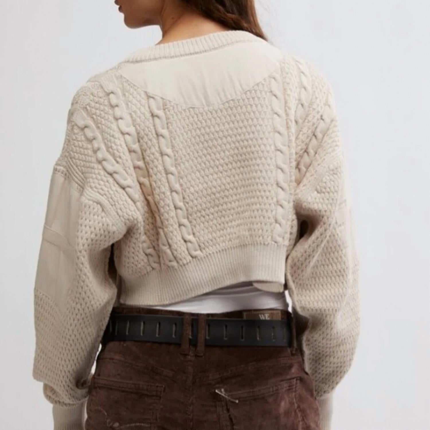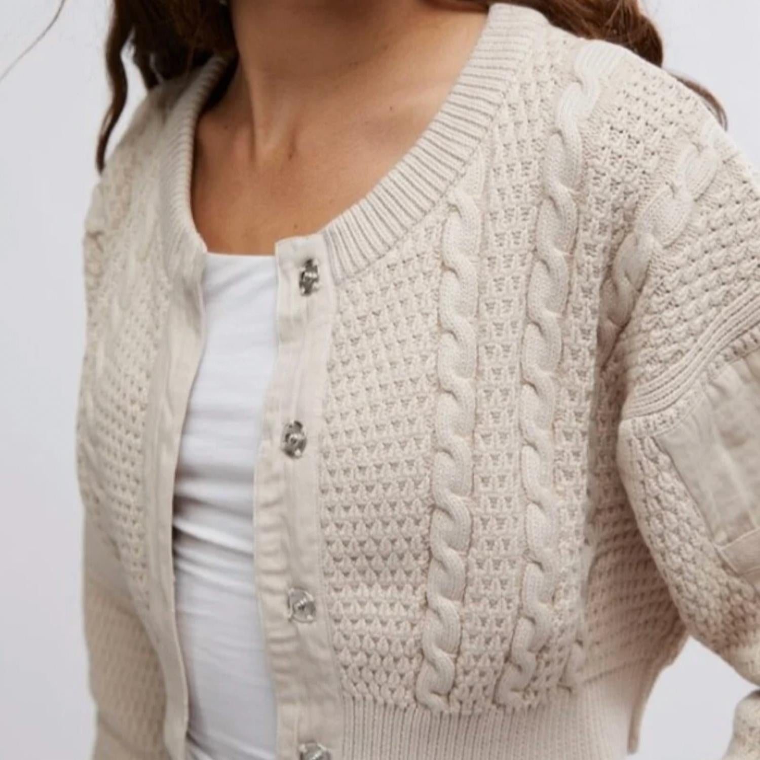 Relaxed, slightly oversized silhouette. Balloon-style sleeves, snap-button closures, classic cable-knit fabrication, ribbed trimming. 1% Elastane 2% Nylon 97% Cotton.