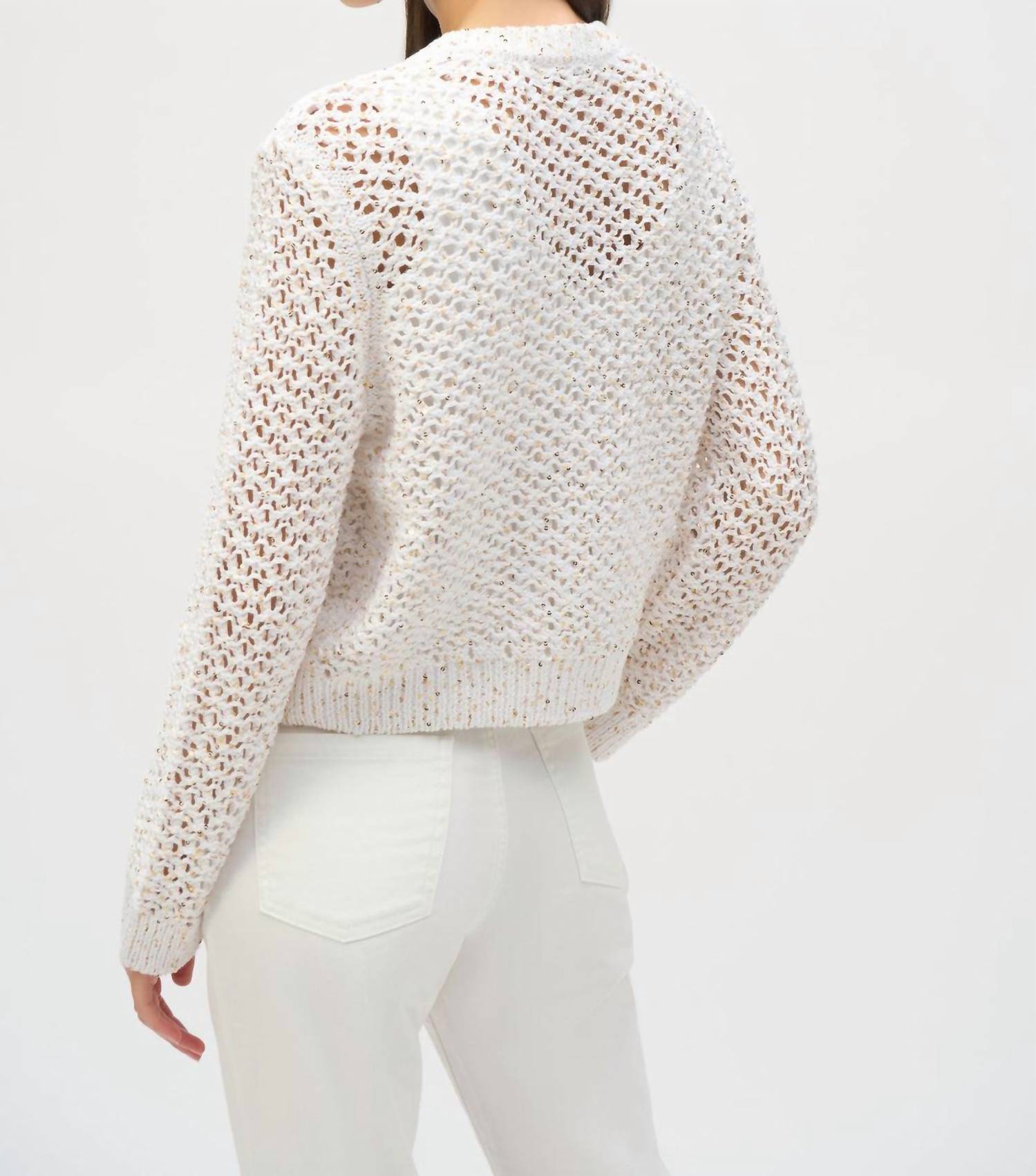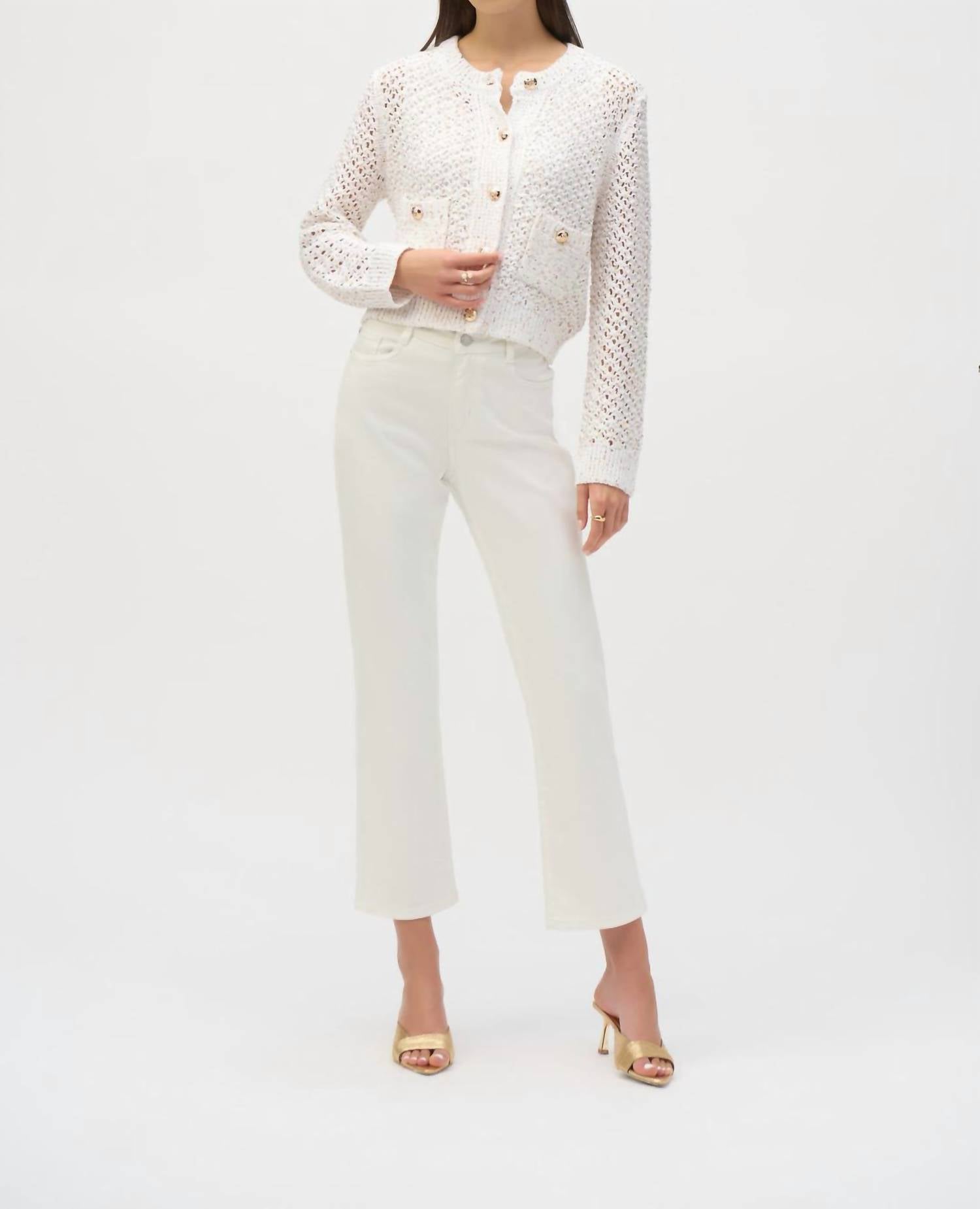 Throw this adorable cardigan over any cami or tank top. Discover the Open Knit Cardigan by Joseph Ribkoff, a luxurious addition to your spring wardrobe in a Vanilla/Gold colorway. This charming piece boasts long sleeves crafted from a soft sweater knit, featuring a premium cotton blend composition of 30% Acrylic, 50% Cotton, 20% Polyester. The cardigan is highlighted by a chic button closure with gold buttons and practical patch pockets, lending a perfect balance of style and functionality. For optimal care, hand wash in cold water, lay flat to dry in the shade, and avoid ironing or tumble drying.