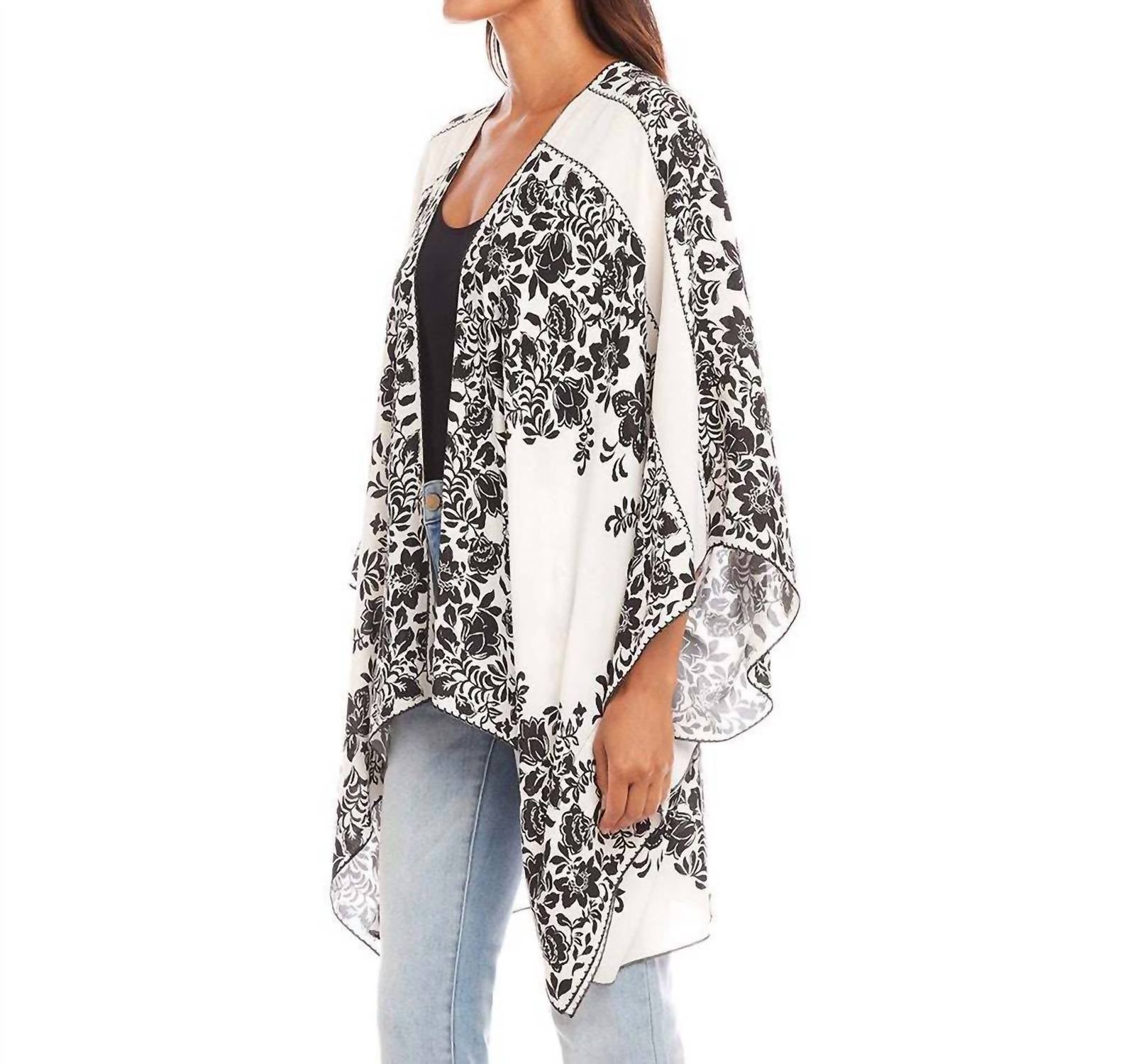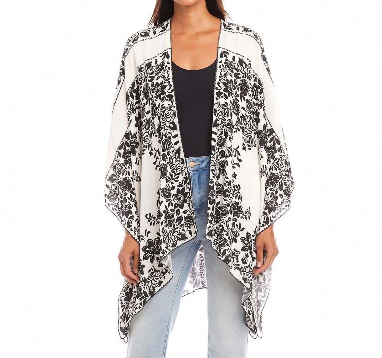 Introducing the Karen Kane Open Front Jacket, the epitome of boho chic for your spring wardrobe. Featuring three-quarter dolman sleeves, this jacket is crafted from 100% Italian viscose, offering luxe feel and texture. Made in the USA with an eye-catching Florence Scarf pattern, it measures 33 inches in length for a stylish drape. With a convenient pull-on closure and care instructions of dry clean only, this piece is easy to layer over slip dresses or tank tops for a sophisticated look.