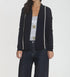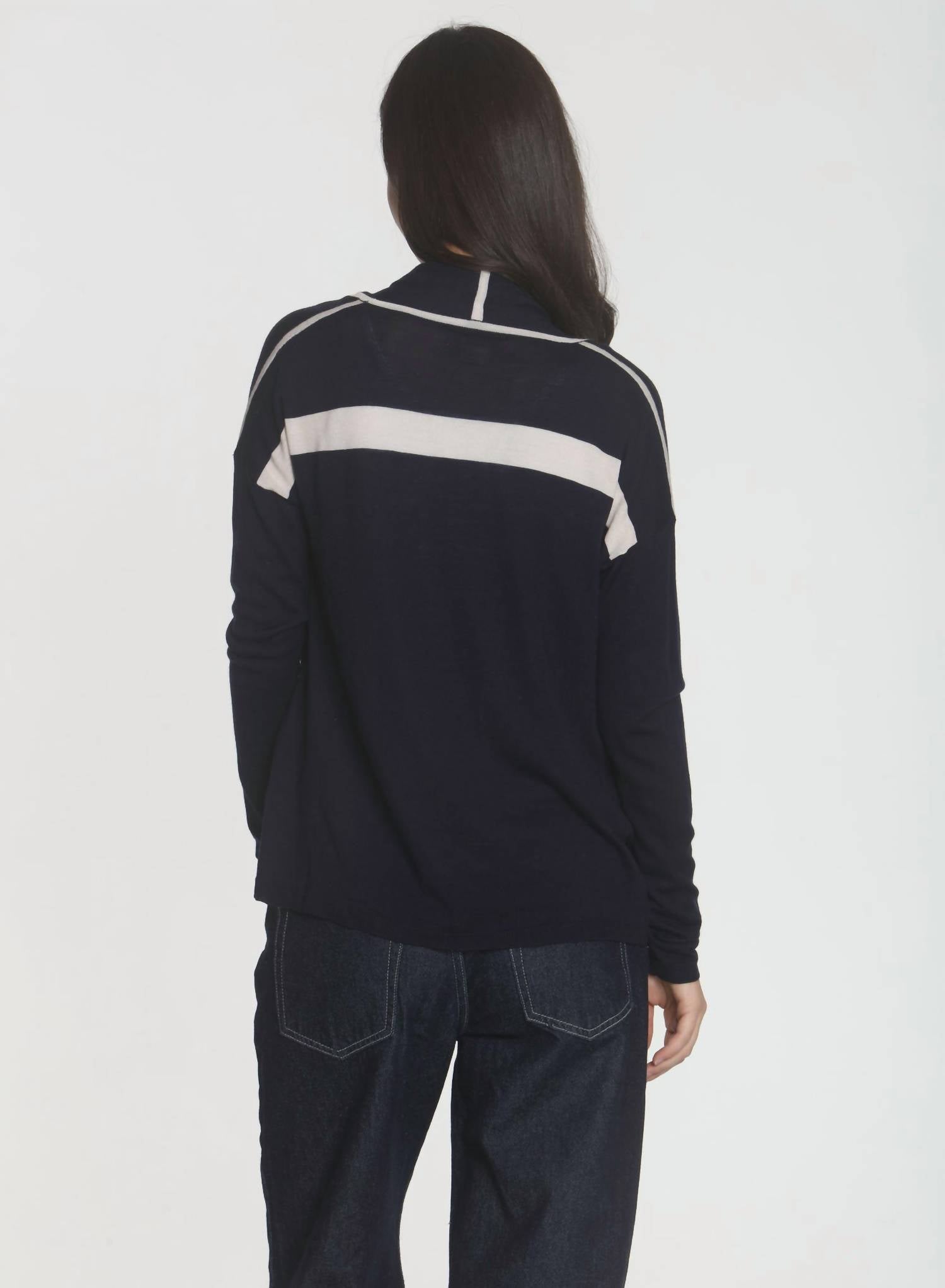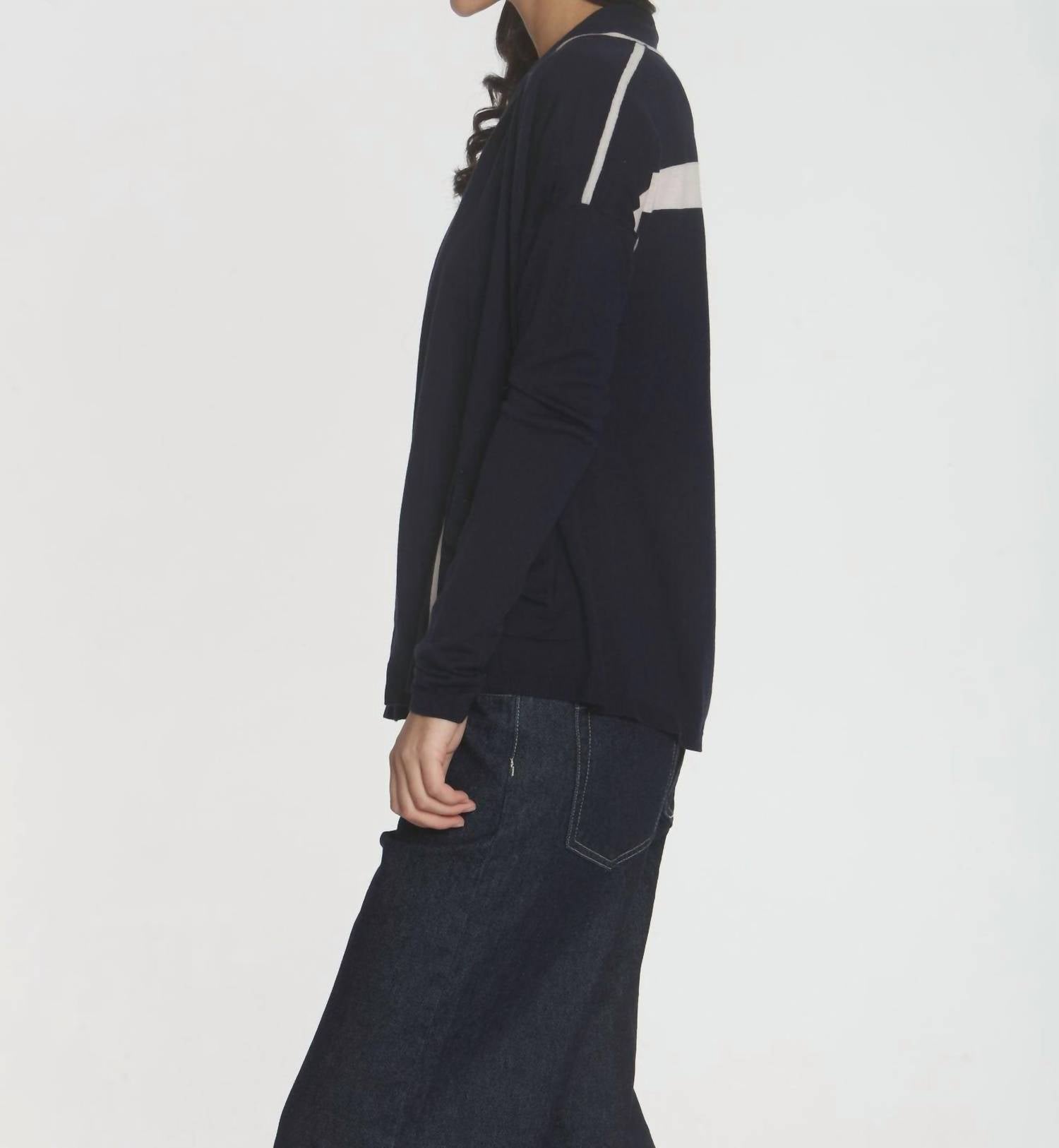 Meet the Women's Brooklyn Drape Cardigan by LABEL+thread, a chic and functional staple in navy for the winter season. This long sleeve cardigan is crafted from 100% superfine Merino wool, offering softness comparable to cashmere. It features a striking stripe at the back and an open drapey design with contrast piping seams, hitting at the hip for a flattering fit. Closure: Pull-on. Care: Hand wash or dry clean.