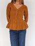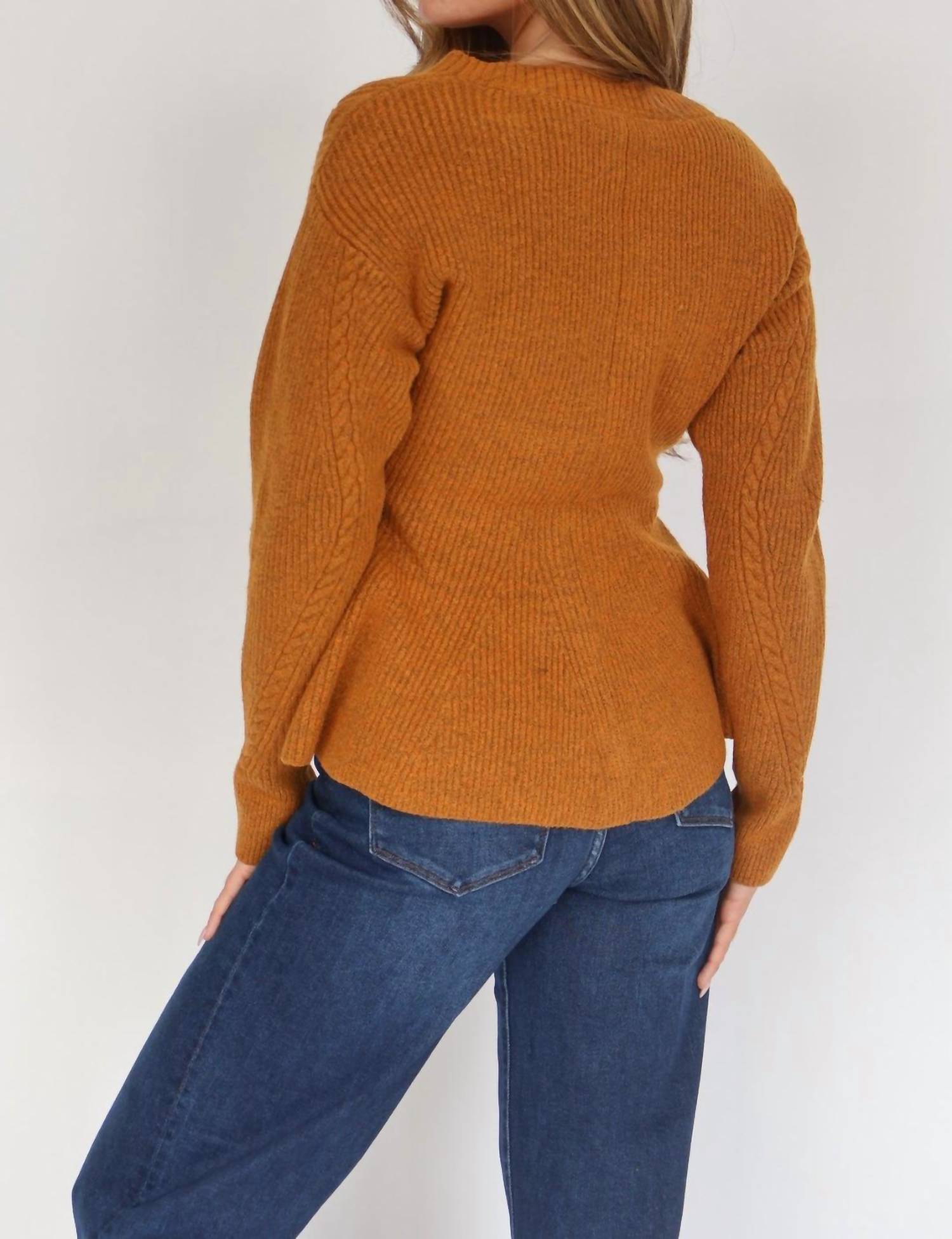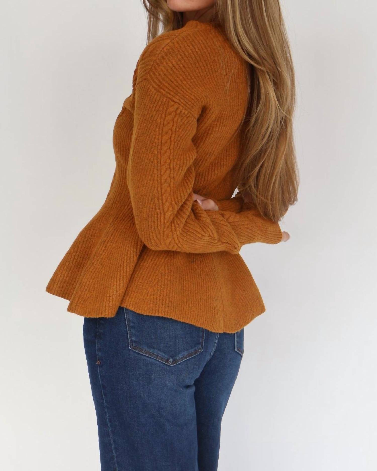 Elevate your holiday party look with the Courtney Peplum Button Front Cardigan by Steve Madden. Crafted in a rich Pumpkin Spice hue, this cardigan showcases a V-neckline and a flattering peplum hemline. The long sleeves and textured pattern offer chic comfort, while the approx. 23.5" length adds a polished touch. Made from 96% Polyester and 4% Spandex, this cardigan features a center front button closure and requires hand washing for care.