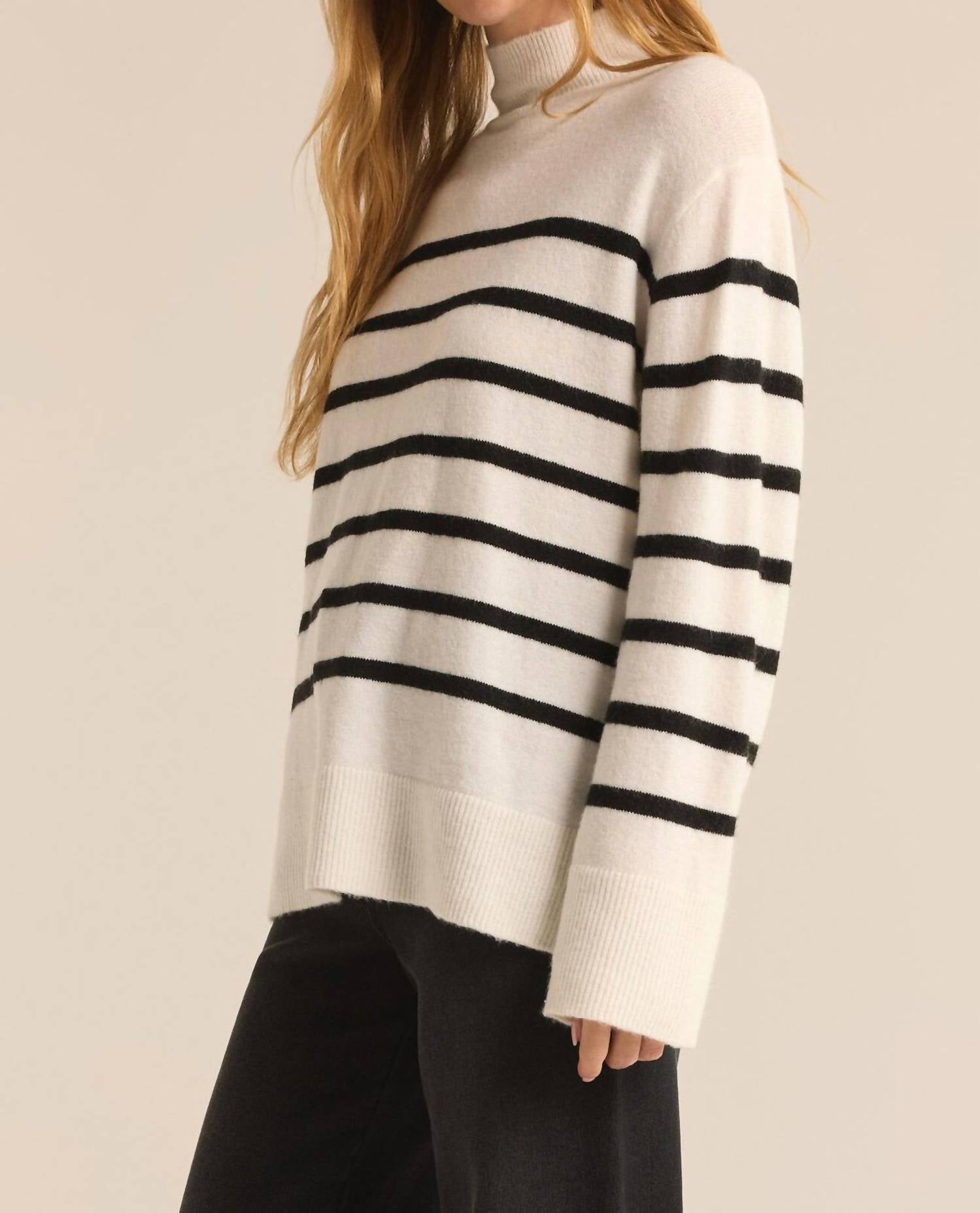 Introducing the Fin Striped Sweater by Z Supply, a must-have for stylish cool-weather dressing. This long sleeve turtleneck sweater in Sea Salt features a bold stripe pattern and a relaxed fit for effortless comfort. Made from a luxurious nylon blend, it incorporates a seamless pull-on closure for ease of wear. Crafted with dimensions ensuring extra coverage and designed for versatile styling, it requires hand washing and should be laid flat to dry.