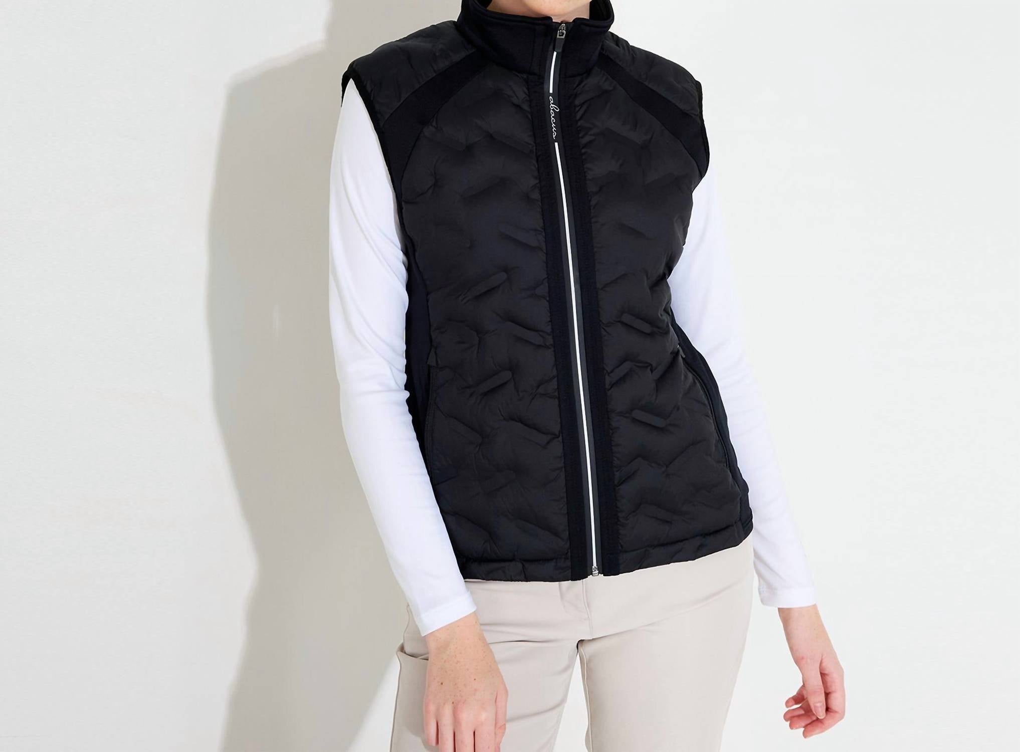 That extra layering piece you didn't know you needed! Introducing the Portrush Hybrid Mock Neck Vest by Abacus Sportswear US, an ideal mid-layer for female golfers seeking performance and style on game day. This sleeveless vest is crafted from solid nylon, offering lightweight warmth and wind protection with its seamless, quilted fabric and insulated padding. Featuring a mock neck and a full-length zip closure, this vest is designed for easy layering, with rib-knit detailing at the hem and inner collar for a secure fit. Care is simple with machine wash and tumble dry instructions, ensuring it's ready for your next spring round.