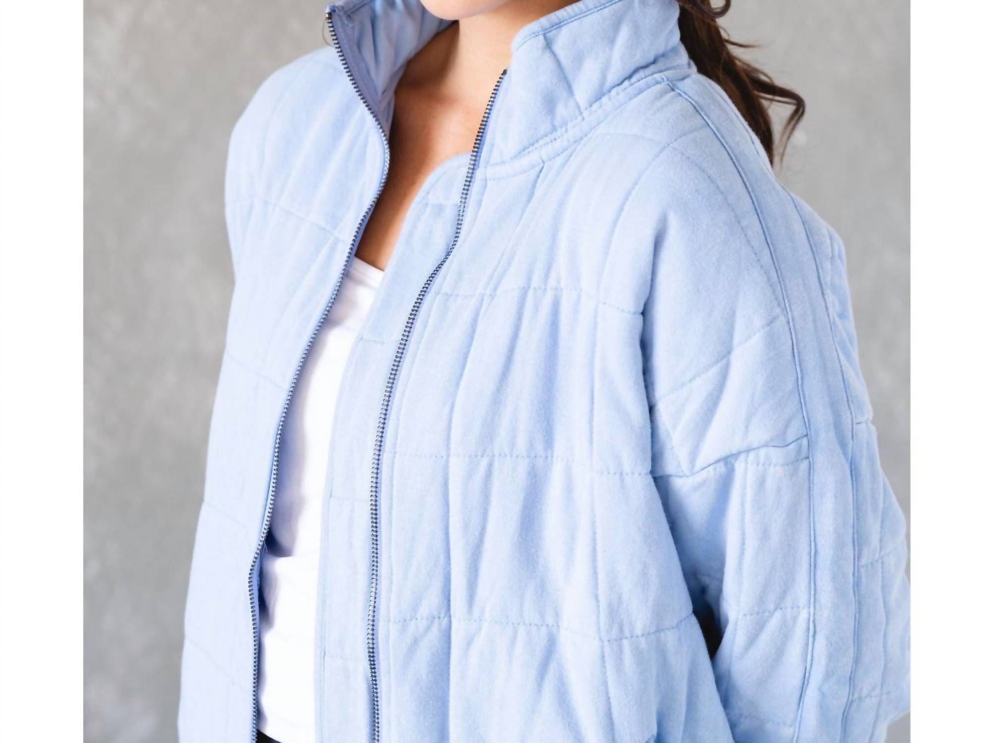 Cozy and cute! This winter jacket is on the top of our favorite's list. Introducing the Sky Blue Dixie Quilted Jacket by AEMI + CO, expertly designed for both style and functionality. This women's ski and snow jacket features long sleeves crafted from 100% cotton, complete with a geometric pattern and collar neckline. The oversized fit enhances comfort, while the practical zip closure and pockets ensure practicality. Embrace the perfect blend of fashion and utility for the cooler seasons.