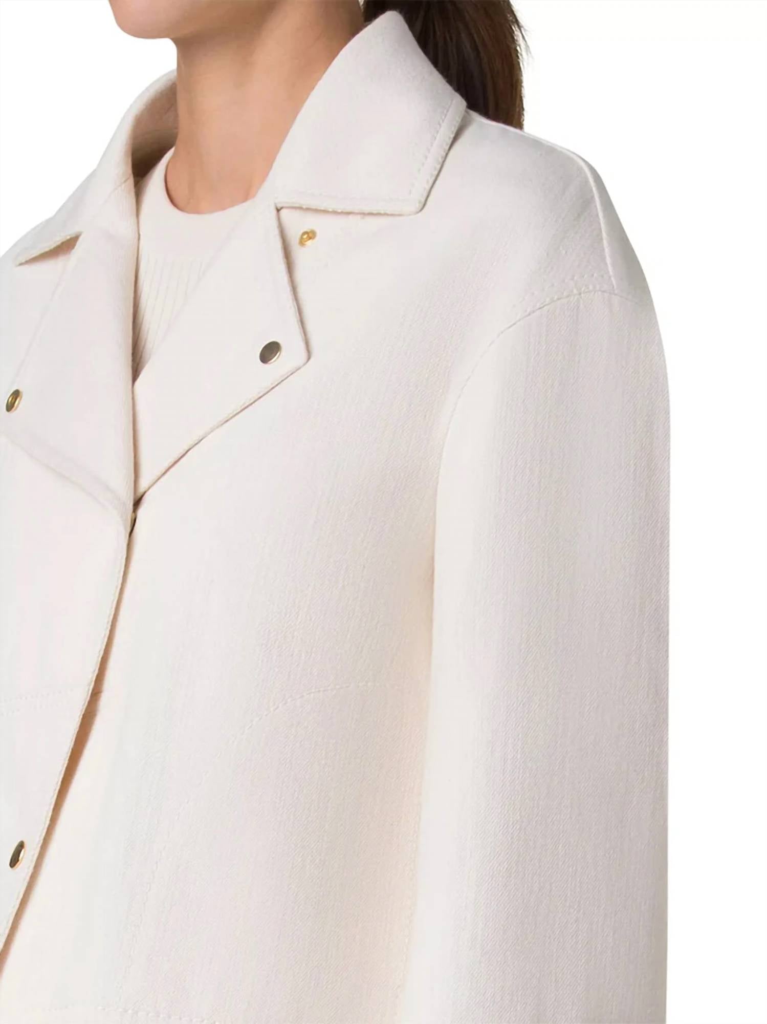 A blazer so versatile you can wear it to the office or pair it with jeans for a more casual look. Introducing the Crop Boxy Biker Jacket by Akris Punto, a stylish addition to any wardrobe this fall. Boasting three-quarter length sleeves and crafted from a cotton-wool blend, this cashew-colored jacket stands out with its biker-style design and asymmetric snap closure. With features like a Napoleon collar, dropped shoulders, and a back box pleat, it offers both form and function. Composition: 81% Cotton, 15% Wool, 4% Nylon with a 100% Cupro lining. Care: Dry clean only.