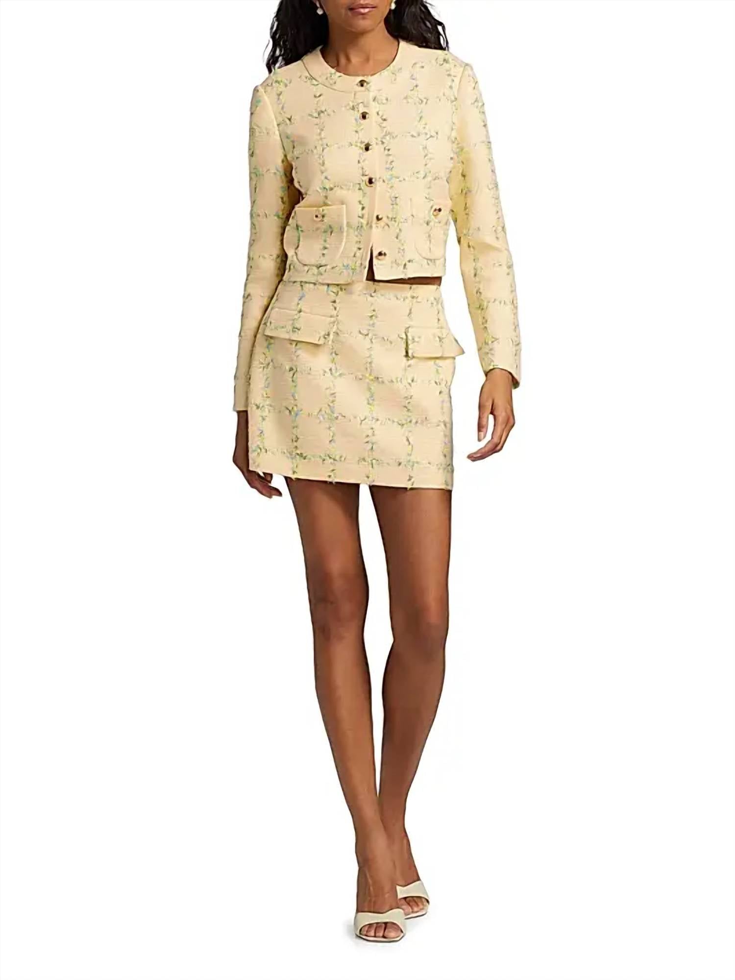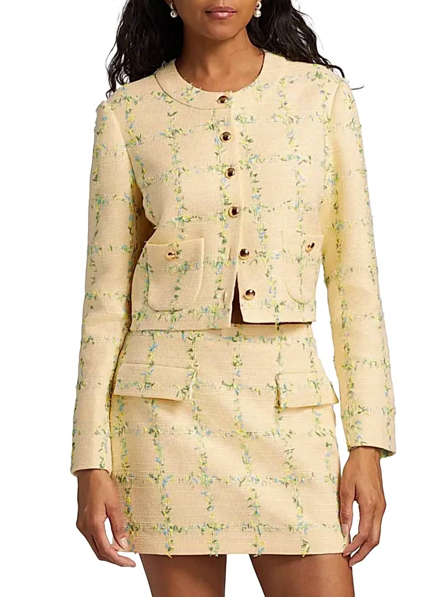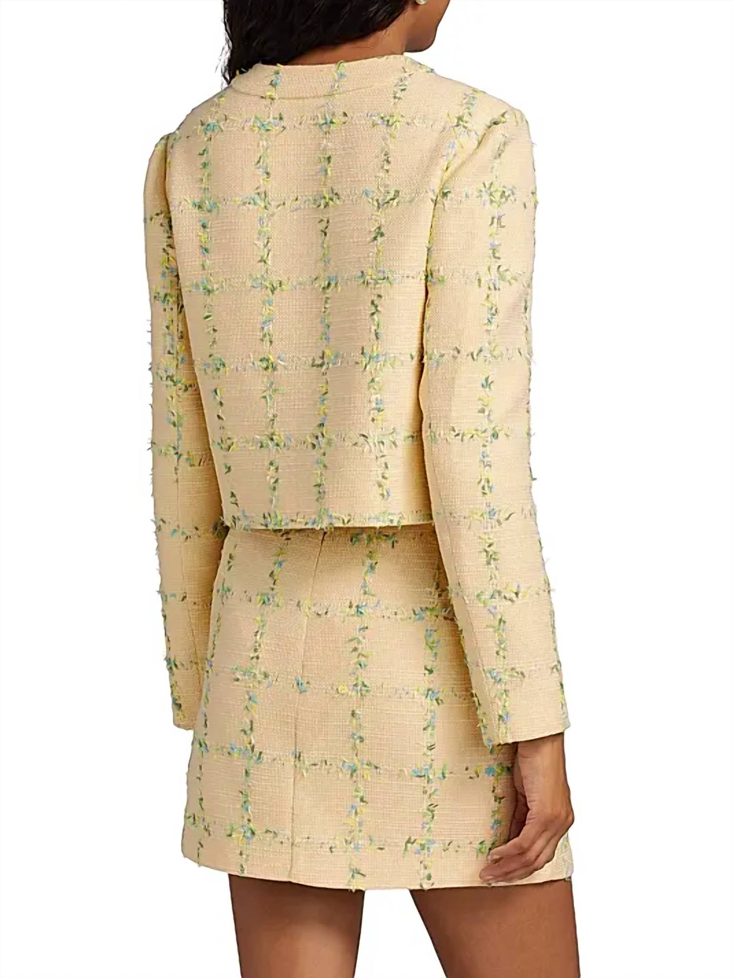 A casual yet cool jacket that every closset needs. Elevate your style with the Maven Check Tweed Jacket by Amanda Uprichard, a must-have statement piece. This women's casual jacket features long sleeves and comes in a vibrant yellow tweed adorned with a check pattern. Crafted from 100% polyester, this imported piece is cropped at about 14.75 inches from shoulder to hem. Closure: Button closure. Care: Dry clean only. Model is 5'10" and wears a US size Small.