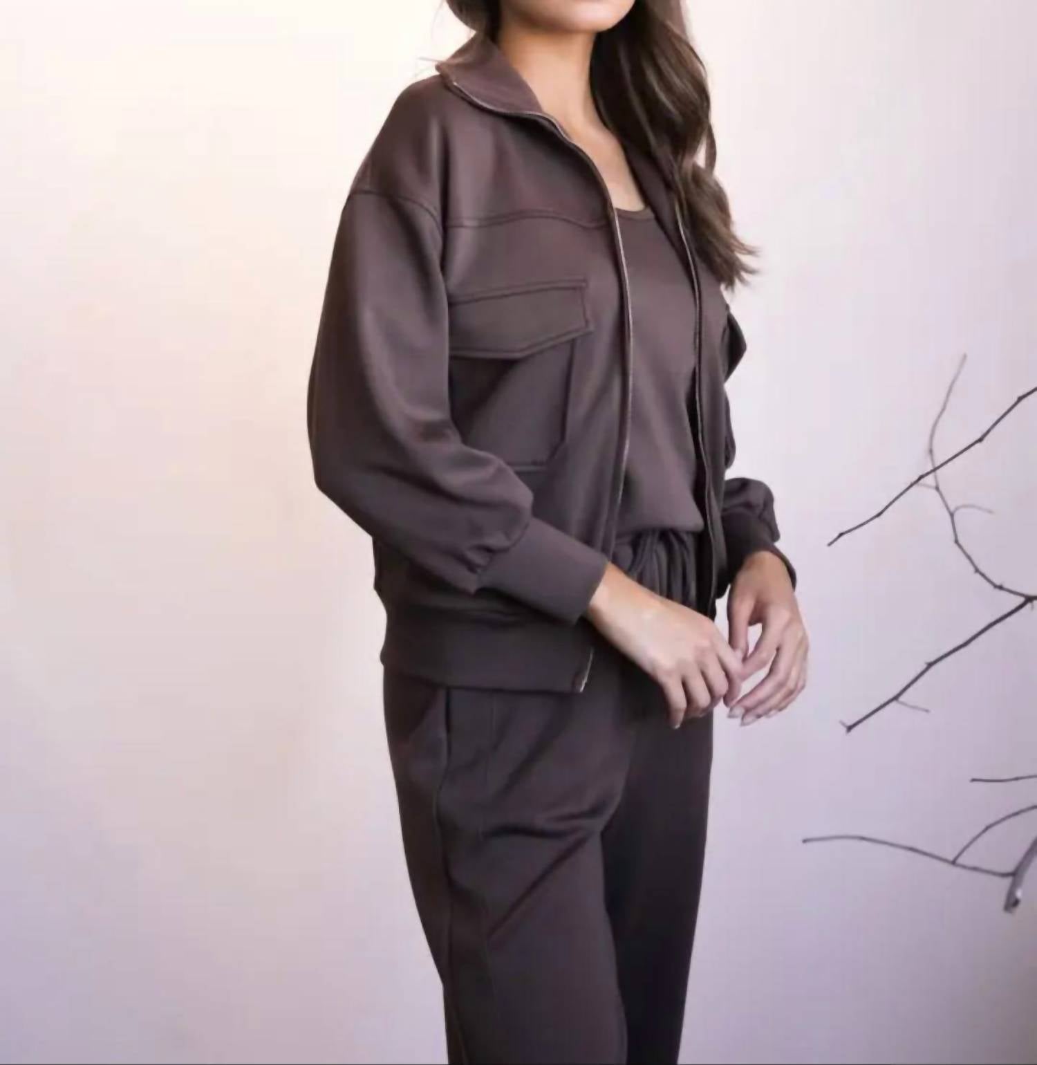 Introducing the Bomber Utility Jacket by Before You, a chic and versatile outer layer in a rich cocoa hue. This jacket features long sleeves and is crafted from lightweight polyester, perfect for fall. The zip-front closure and utility-inspired front flap pockets add functionality, while the relaxed silhouette with ribbed cuffs and hem ensures a comfortable fit. Care instructions include machine wash and hang dry, allowing for easy maintenance.