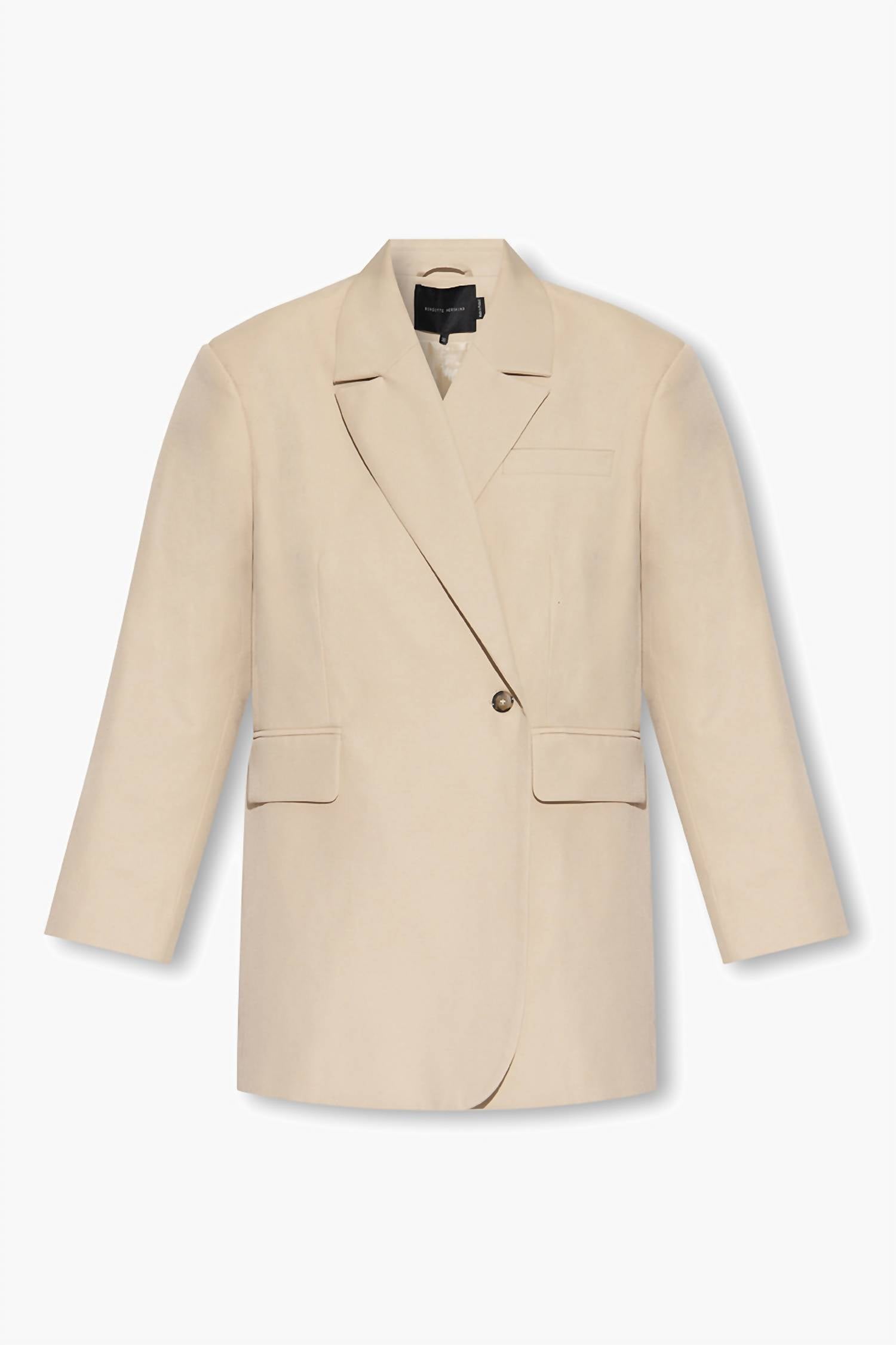 An elevated version of your favorite classic blazer. The Verner Blazer by Birgitte Herskind is a sophisticated addition to your wardrobe, perfect for workwear and crafted in a solid beige tone. This stylish piece features long sleeves with button cuffs, peak lapels, and a sleek button closure. Made from a blend of 60% recycled polyester and 40% cotton, it offers an oversized fit and includes one slip pocket and two flapped pockets for a touch of practicality. Ideal for fall, this blazer is designed for women seeking a polished look.